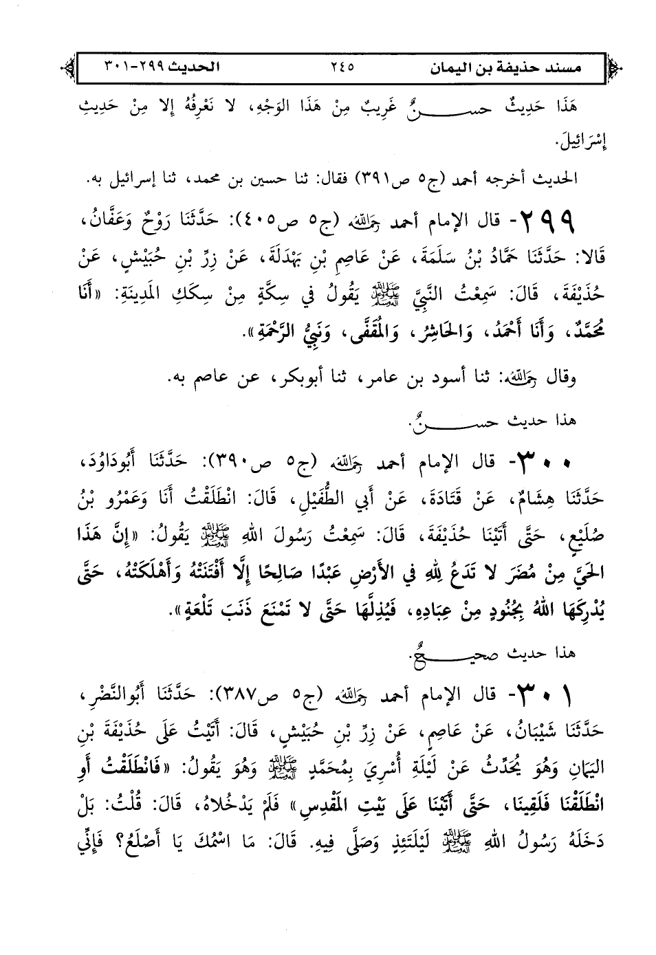 299 - قال الإمام أحمد رحمه الله (ج 5 ص 405): حدثنا روح وعفان قالا حدثنا حماد بن سلمة عن عاصم بن بهدلة عن زر بن حبيش عن حذيفة قال: سمعت النبي صلى الله عليه وعلى آله وسلم يقول في سكة من سكك المدينة «أنا محمد وأنا أحمد والحاشر والمقفى ونبي الرحمة».