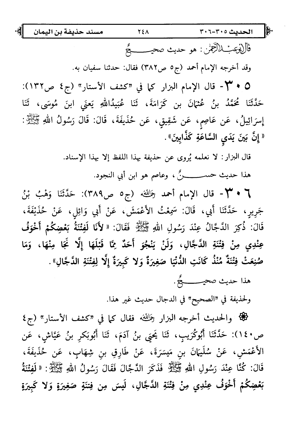305 - قال الإمام البزار كما في "كشف الأستار" (ج 4 ص 132): حدثنا محمد بن عثمان بن كرامة، ثنا عبيد الله يعني ابن موسى، ثنا إسرائيل، عن عاصم، عن شقيق، عن حذيفة قال: قال رسول الله صلى الله عليه وعلى آله وسلم: «إن بين يدي الساعة كذابين».