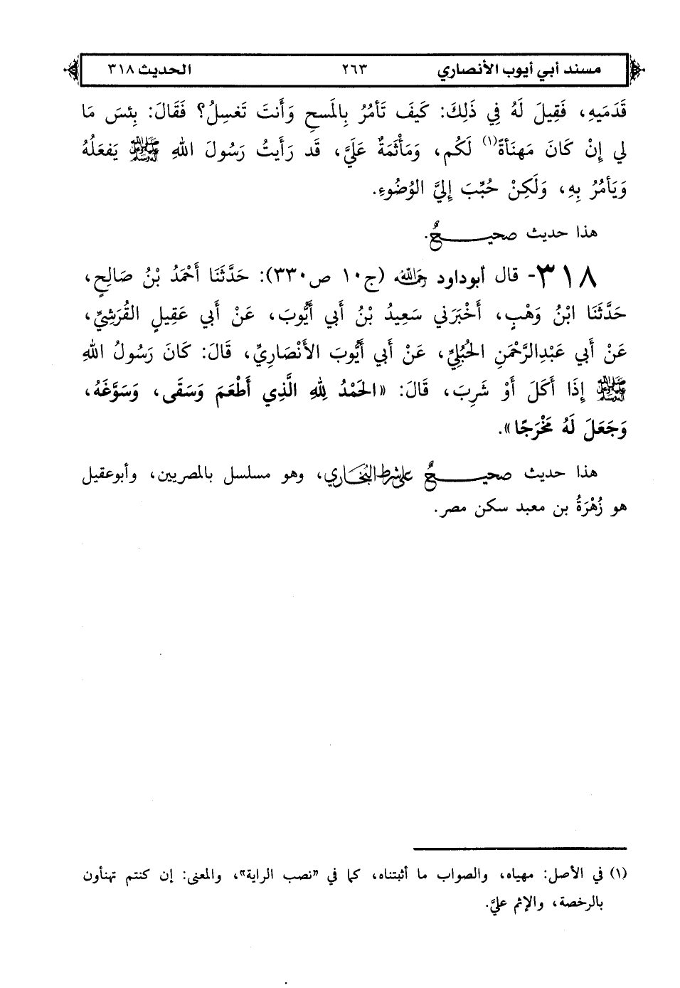 318 - قال أبو داود رحمه الله (ج 10 ص 330): حَدَّثَنَا أَحْمَدُ بْنُ صَالِحٍ حَدَّثَنَا ابْنُ وَهْبٍ أَخْبَرَنِي سَعِيدُ بْنُ أَبِي أَيُّوبَ عَنْ أَبِي عَقِيلٍ الْقُرَشِيِّ عَنْ أَبِي عَبْدِ الرَّحْمَنِ الْحُبُلِيِّ عَنْ أَبِي أَيُّوبَ الْأَنْصَارِيِّ قَالَ: كَانَ رَسُولُ اللهِ صَلَّى اللهُ عَلَيْهِ وَعَلَى آلِهِ وَسَلَّمَ إِذَا أَكَلَ أَوْ شَرِبَ قَالَ «الْحَمْدُ لِلَّهِ الَّذِي أَطْعَمَ وَسَقَى وَسَوَّغَهُ وَجَعَلَ لَهُ مَخْرَجًا».