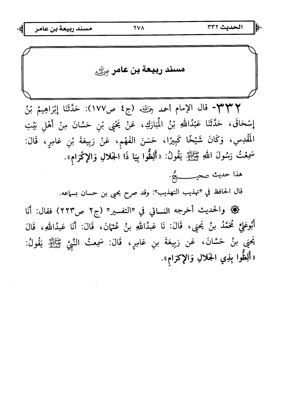 332 - قال الإمام أحمد رحمه الله (ج 4 ص 177): حَدَّثَنَا إِبْرَاهِيمُ بْنُ إِسْحَاقَ حَدَّثَنَا عَبْدُ اللهِ بْنُ الْمُبَارَكِ عَنْ يَحْيَى بْنِ حَسَّانَ مِنْ أَهْلِ بَيْتِ الْمَقْدِسِ وَكَانَ شَيْخًا كَبِيرًا حَسَنَ الْفَهْمِ عَنْ رَبِيعَةَ بْنِ عَامِرٍ قَالَ سَمِعْتُ رَسُولَ اللهِ صَلَّى اللهُ عَلَيْهِ وَعَلَى آلِهِ وَسَلَّمَ يَقُولُ «أَلِظُّوا بِيَا ذَا الْجَلَالِ وَالْإِكْرَامِ».