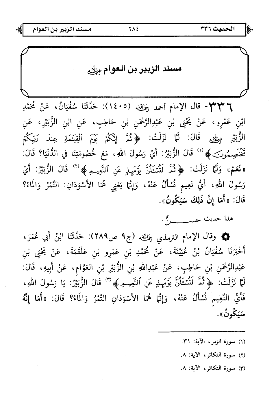 336 - قال الإمام أحمد رحمه الله (1405): حدثنا سفيان عن محمد بن عمرو عن يحيى بن عبد الرحمن بن حاطب عن ابن الزبير عن الزبير رضي الله عنه قال: لما نزلت {ثم إنكم يوم القيامة عند ربكم تختصمون} (1) قال الزبير أي رسول الله مع خصومتنا في الدنيا قال «نعم» ولما نزلت {ثم لتسألن يومئذ عن النعيم} (2) قال الزبير أي رسول الله أي نعيم نسأل عنه وإنما يعني هما الأسودان التمر والماء قال «أما إن ذلك سيكون».