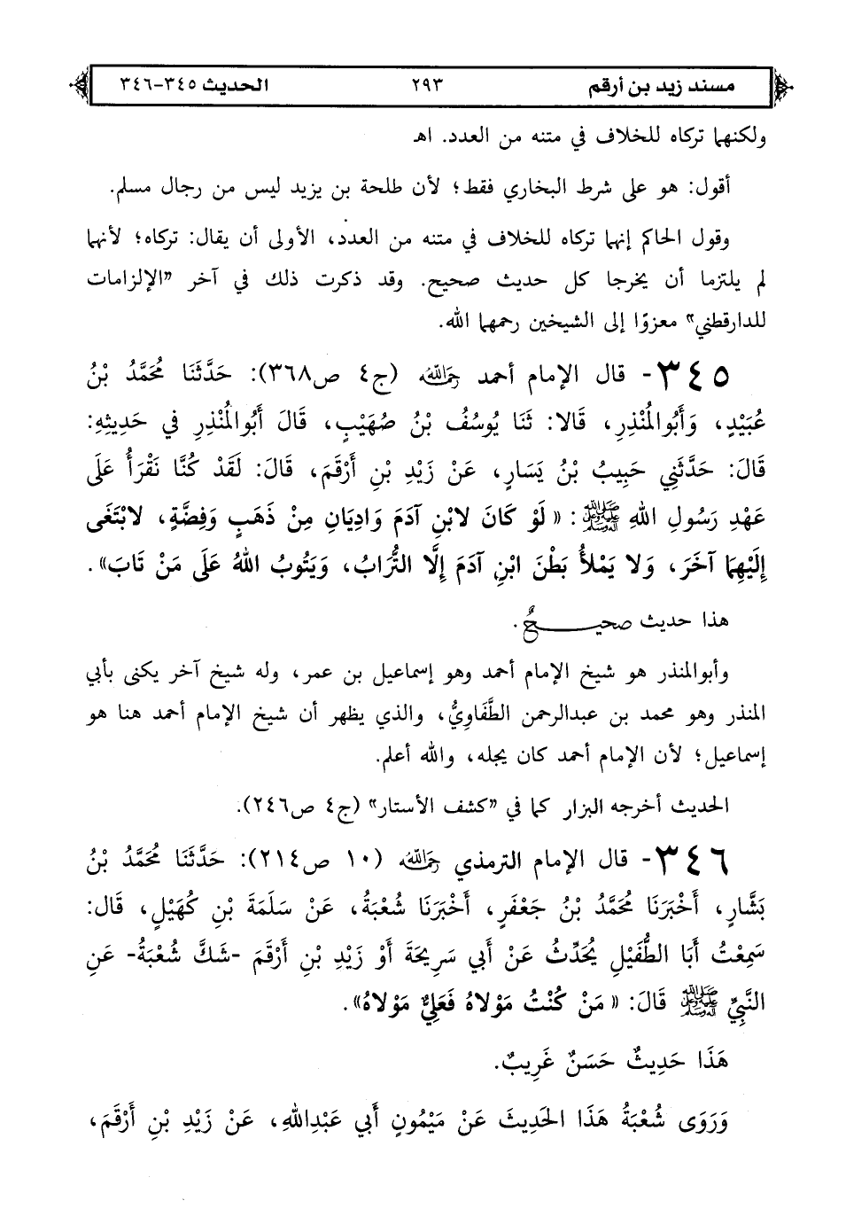 346 - قال الإمام الترمذي رحمه الله (ج 10 ص 214): حَدَّثَنَا مُحَمَّدُ بْنُ بَشَّارٍ أخبرَنَا مُحَمَّدُ بْنُ جَعْفَرٍ أخبرَنَا شُعْبَةُ عَنْ سَلَمَةَ بْنِ كُهَيْلٍ قَال سَمِعْتُ أَبَا الطُّفَيْلِ يُحَدِّثُ عَنْ أَبِي سَرِيحَةَ أَوْ زَيْدِ بْنِ أَرْقَمَ -شَكَّ شُعْبَةُ-: عَنْ النَّبِيِّ صَلَّى اللهُ عَلَيْهِ وَعَلَى آلِهِ وَسَلَّمَ قَالَ «مَنْ كُنْتُ مَوْلَاهُ فَعَلِيٌّ مَوْلَاهُ».