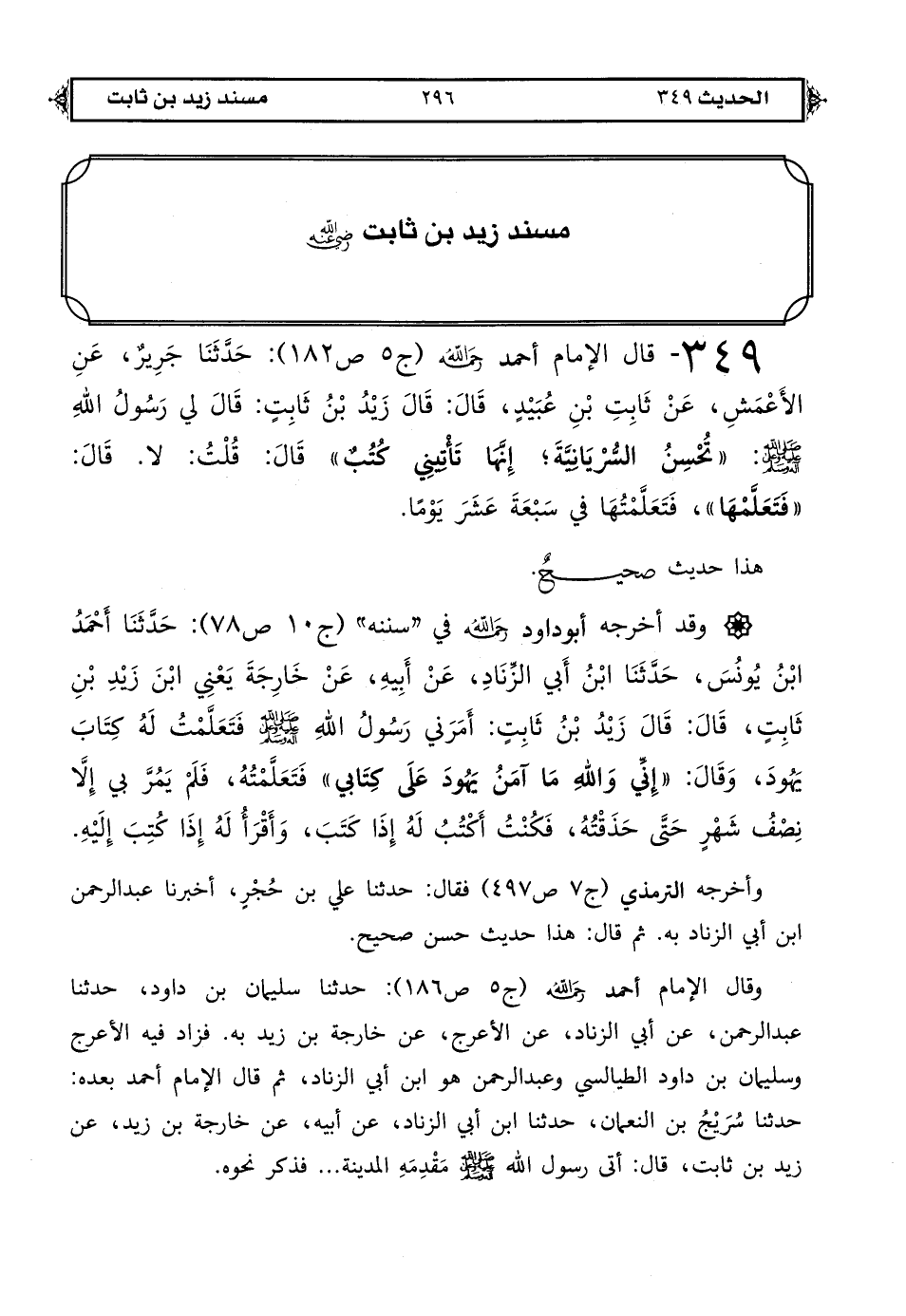 349 - قال الإمام أحمد رحمه الله (ج 5 ص 182): حَدَّثَنَا جَرِيرٌ عَنِ الْأَعْمَشِ عَنْ ثَابِتِ بْنِ عُبَيْدٍ قَالَ قَالَ زَيْدُ بْنُ ثَابِتٍ: قَالَ لِي رَسُولُ اللهِ صَلَّى اللهُ عَلَيْهِ وَعَلَى آلِهِ وَسَلَّمَ «تُحْسِنُ السُّرْيَانِيَّةَ؟ إِنَّهَا تَأْتِينِي كُتُبٌ» قَالَ قُلْتُ لَا قَالَ «فَتَعَلَّمْهَا» فَتَعَلَّمْتُهَا فِي سَبْعَةَ عَشَرَ يَوْمًا.