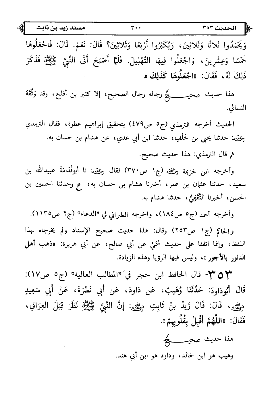 353 - قال الحافظ ابن حجر في "المطالب العالية" (ج 5 ص 17): قالَ أبو داود: حدثنا وهيب، عن داود، عن أبي نضرة، عن أبي سعيد رضي الله عنه، قال: قال زيد بن ثابت رضي الله عنه: إن النبي صلى الله عليه وعلى آله وسلم نظر قبل العراق، فقال: «اللهم أقبل بقلوبهم».