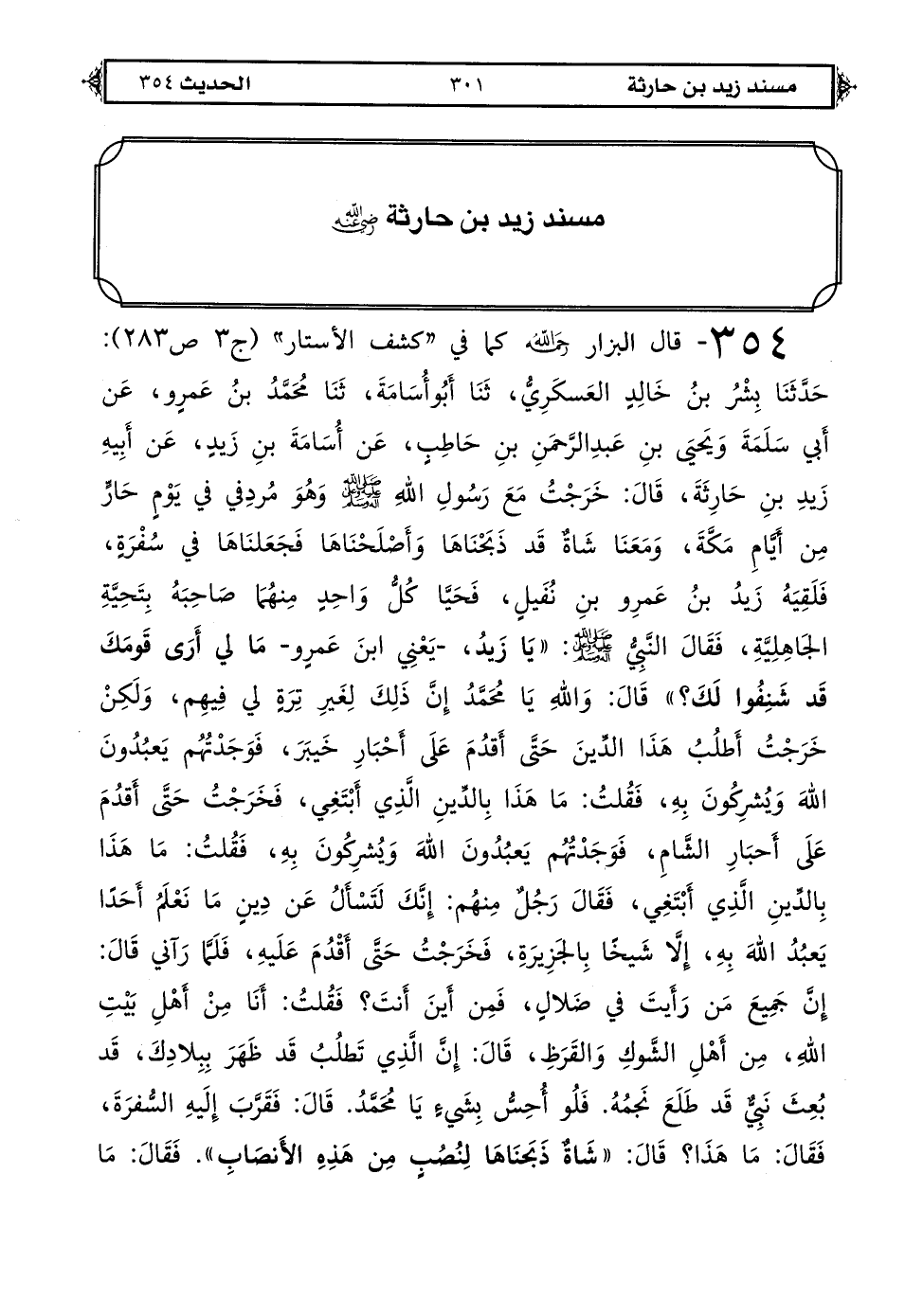 354 - قال البزار رحمه الله كما في "كشف الأستار" (ج 3 ص 283): حَدَّثَنَا بِشْرُ بْنُ خَالِدٍ الْعَسْكَرِيُّ، ثَنَا أَبُو أُسَامَةَ، ثَنَا مُحَمَّدُ بْنُ عَمْرٍو، عَنْ أَبِي سَلَمَةَ وَيَحْيَى بْنِ عَبْدِ الرَّحْمَنِ بْنِ حَاطِبٍ، عَنْ أُسَامَةَ بْنِ زَيْدٍ، عَنْ أَبِيهِ زَيْدِ بْنِ حَارِثَةَ، قَالَ: خَرَجْتُ مَعَ رَسُولِ اللهِ صلى الله عليه وعلى آله وسلم وَهُوَ مُرْدِفِي فِي يَوْمٍ حَارٍّ مِنْ أَيَّامِ مَكَّةَ، وَمَعَنَا شَاةٌ قَدْ ذَبَحْنَاهَا وَأَصْلَحْنَاهَا فَجَعَلْنَاهَا فِي سُفْرَةٍ، فَلَقِيَهُ زَيْدُ بْنُ عَمْرِو بْنِ نُفَيْلٍ، فَحَيَّا كُلُّ وَاحِدٍ مِنْهُمَا صَاحِبَهُ بِتَحِيَّةِ الْجَاهِلِيَّةِ، فَقَالَ النَّبِيُّ صلى الله عليه وعلى آله وسلم: «يَا زَيْدُ -يَعْنِي ابْنَ عَمْرٍو-، مَا لِي أَرَى قَوْمَكَ قَدْ شَنِفُوا لَكَ؟ » قَالَ: وَاللهِ يَا مُحَمَّدُ، إِنَّ ذَلِكَ لِغَيْرِ تِرَةٍ لِي فِيهِمْ، وَلَكِنْ خَرَجْتُ أَطْلُبُ هَذَا الدِّينَ حَتَّى أَقْدُمَ عَلَى أَحْبَارِ خَيْبَرَ، فَوَجَدْتُهُمْ يَعْبُدُونَ اللهَ وَيُشْرِكُونَ بِهِ، فَقُلْتُ: مَا هَذَا بِالدِّينِ الَّذِي أَبْتَغِي، فَخَرَجْتُ حَتَّى أَقْدُمَ عَلَى أَحْبَارِ الشَّامِ، فَوَجَدْتُهُمْ يَعْبُدُونَ اللهَ وَيُشْرِكُونَ بِهِ، فَقُلْتُ: مَا هَذَا بِالدِّينِ الَّذِي أَبْتَغِي، فَقَالَ رَجُلٌ مِنْهُمْ: إِنَّكَ لَتَسْأَلُ عَنْ دِينٍ مَا نَعْلَمُ أَحَدًا يَعْبُدُ اللهَ بِهِ إِلَّا شَيْخًا بِالْجَزِيرَةِ، فَخَرَجْتُ حَتَّى أَقْدُمَ عَلَيْهِ، فَلَمَّا رَآنِي قَالَ: إِنَّ جَمِيعَ مَنْ رَأَيْتَ فِي ضَلالٍ، فَمِنْ أَيْنَ أَنْتَ؟ فَقُلْتُ: أَنَا مِنْ أَهْلِ بَيْتِ اللهِ، مِنْ أَهْلِ الشَّوْكِ وَالْقَرَظِ. قَالَ: إِنَّ الَّذِي تَطْلُبُ قَدْ ظَهْرَ بِبِلَادِكَ، قَدْ بُعِثَ نَبِيٌّ قَدْ طَلَعَ نَجْمُهُ، فَلَوْ أُحِسُّ بِشَيْءٍ يَا مُحَمَّدُ. قَالَ: فَقَرَّبَ إِلَيْهِ السُّفْرَةَ، فَقَالَ: مَا هَذَا؟ قَالَ: «شَاةٌ ذَبَحْنَاهَا لِنُصُبٍ مِنْ هَذِهِ الأَنْصَابِ». فَقَالَ: مَا [ص: 302] كُنْتُ لِآكُلَ شَيْئًا ذُبِحَ لِغَيْرِ اللهِ. وَتَفَرَّقَا.