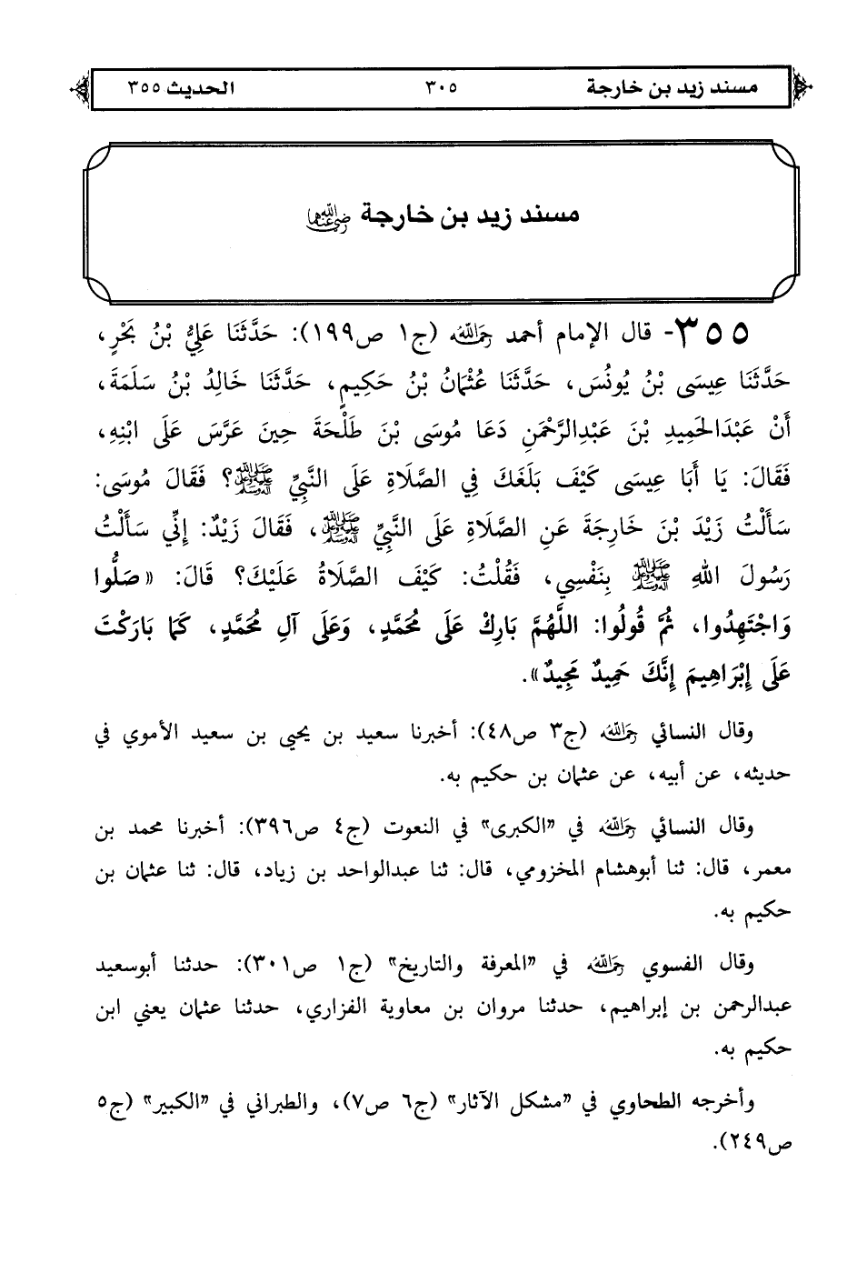 355 - قال الإمام أحمد رحمه الله (ج 1 ص 199): حَدَّثَنَا عَلِيُّ بْنُ بَحْرٍ حَدَّثَنَا عِيسَى بْنُ يُونُسَ حَدَّثَنَا عُثْمَانُ بْنُ حَكِيمٍ حَدَّثَنَا خَالِدُ بْنُ سَلَمَةَ أَنْ عَبْدَ الْحَمِيدِ بْنَ عَبْدِ الرَّحْمَنِ دَعَا مُوسَى بْنَ طَلْحَةَ حِينَ عَرَّسَ عَلَى ابْنِهِ فَقَالَ يَا أَبَا عِيسَى كَيْفَ بَلَغَكَ فِي الصَّلَاةِ عَلَى النَّبِيِّ صَلَّى اللهُ عَلَيْهِ وَعَلَى آلِهِ وَسَلَّمَ فَقَالَ مُوسَى سَأَلْتُ زَيْدَ بْنَ خَارِجَةَ عَنْ الصَّلَاةِ عَلَى النَّبِيِّ صَلَّى اللهُ عَلَيْهِ وَعَلَى آلِهِ وَسَلَّمَ فَقَالَ زَيْدٌ: إِنِّي سَأَلْتُ رَسُولَ اللهِ صَلَّى اللهُ عَلَيْهِ وَعَلَى آلِهِ وَسَلَّمَ بِنَفْسِي فَقُلْتُ كَيْفَ الصَّلَاةُ عَلَيْكَ قَالَ «صَلُّوا وَاجْتَهِدُوا ثُمَّ قُولُوا اللَّهُمَّ بَارِكْ عَلَى مُحَمَّدٍ وَعَلَى آلِ مُحَمَّدٍ كَمَا بَارَكْتَ عَلَى إِبْرَاهِيمَ إِنَّكَ حَمِيدٌ مَجِيدٌ».