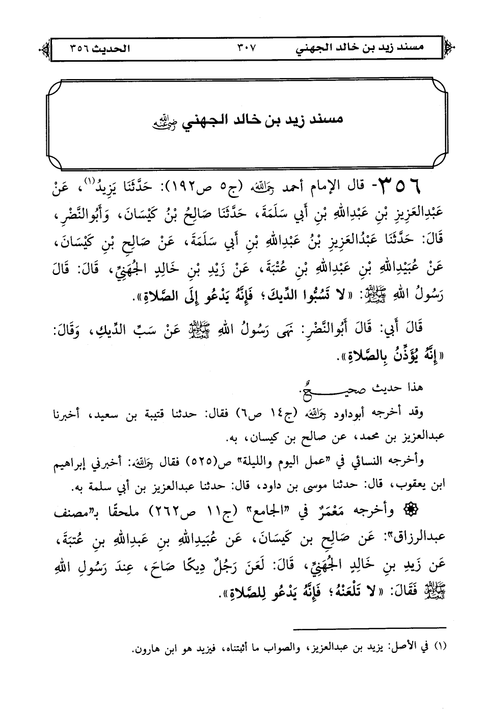 356 - قال الإمام أحمد رحمه الله (ج 5 ص 192): حَدَّثَنَا يَزِيدُ (1) عَنْ عَبْدِ الْعَزِيزِ بْنِ عَبْدِ اللهِ بْنِ أَبِي سَلَمَةَ حَدَّثَنَا صَالِحُ بْنُ كَيْسَانَ -وَأَبُو النَّضْرِ قَالَ حَدَّثَنَا عَبْدُ الْعَزِيزِ بْنُ عَبْدِ اللهِ بْنِ أَبِي سَلَمَةَ عَنْ صَالِحِ بْنِ كَيْسَانَ- عَنْ عُبَيْدِ اللهِ بْنِ عَبْدِ اللهِ بْنِ عُتْبَةَ عَنْ زَيْدِ بْنِ خَالِدٍ الْجُهَنِيِّ قَالَ: قَالَ رَسُولُ اللهِ صَلَّى اللهُ عَلَيْهِ وَعَلَى آلِهِ وَسَلَّمَ «لَا تَسُبُّوا الدِّيكَ فَإِنَّهُ يَدْعُو إِلَى الصَّلَاةِ».