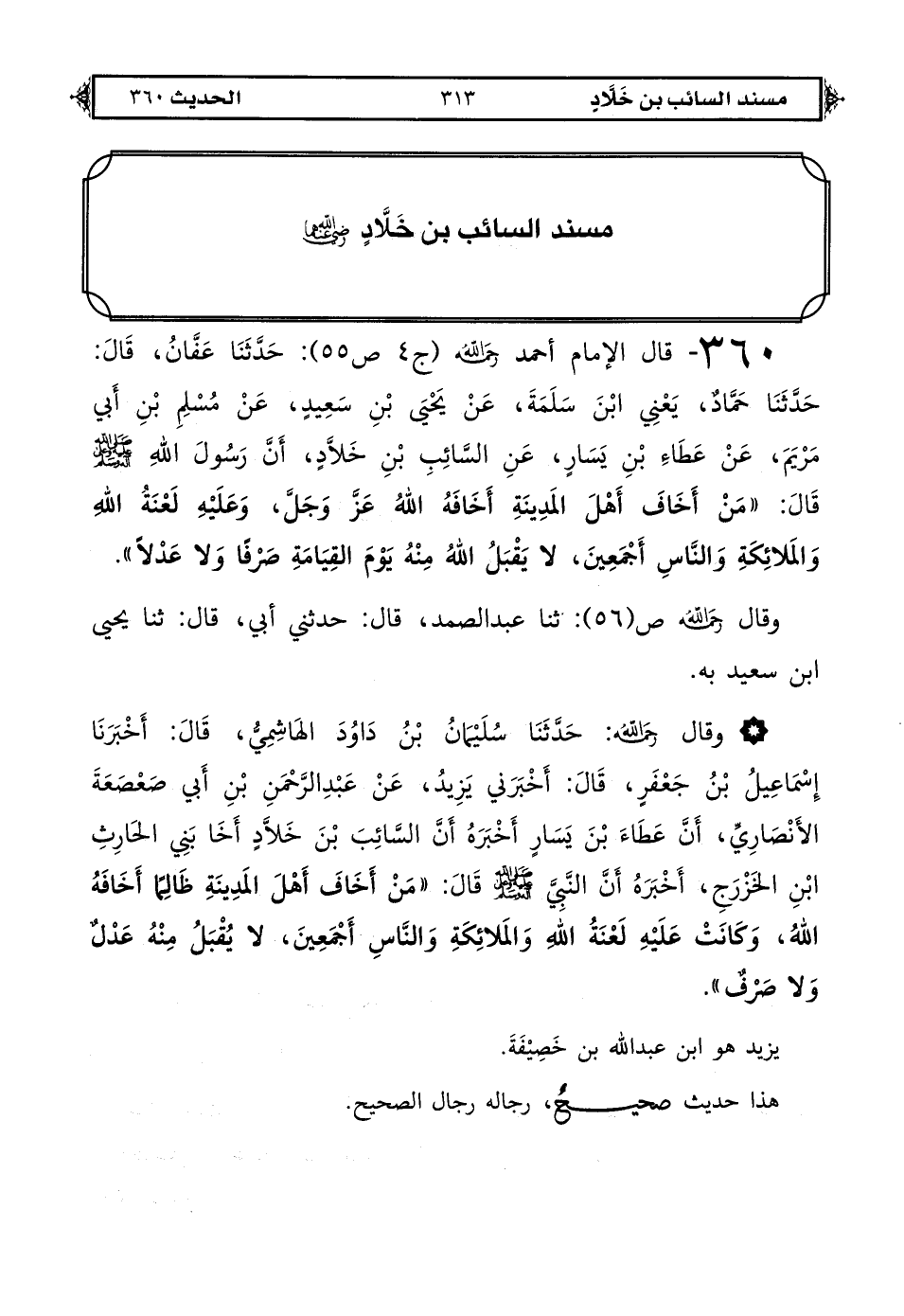 360 - قال الإمام أحمد رحمه الله (ج 4 ص 55): حَدَّثَنَا عَفَّانُ قَالَ حَدَّثَنَا حَمَّادٌ يَعْنِي ابْنَ سَلَمَةَ عَنْ يَحْيَى بْنِ سَعِيدٍ عَنْ مُسْلِمِ بْنِ أَبِي مَرْيَمَ عَنْ عَطَاءِ بْنِ يَسَارٍ عَنِ السَّائِبِ بْنِ خَلَّادٍ: أَنَّ رَسُولَ اللهِ صَلَّى اللهُ عَلَيْهِ وَعَلَى آلِهِ وَسَلَّمَ قَالَ «مَنْ أَخَافَ أَهْلَ الْمَدِينَةِ أَخَافَهُ اللهُ عَزَّ وَجَلَّ وَعَلَيْهِ لَعْنَةُ اللهِ وَالْمَلَائِكَةِ وَالنَّاسِ أَجْمَعِينَ لَا يَقْبَلُ اللهُ مِنْهُ يَوْمَ الْقِيَامَةِ صَرْفًا وَلَا عَدْلًا».
