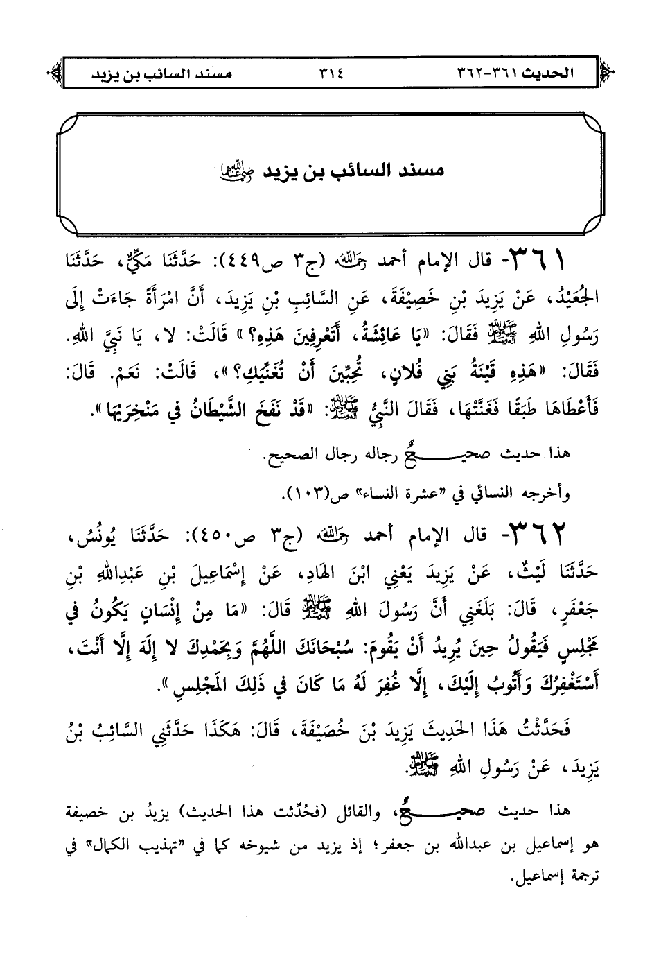 361 - قال الإمام أحمد رحمه الله (ج 3 ص 449): حَدَّثَنَا مَكِّيٌّ حَدَّثَنَا الْجُعَيْدُ عَنْ يَزِيدَ بْنِ خَصِيفَةَ عَنِ السَّائِبِ بْنِ يَزِيدَ: أَنَّ امْرَأَةً جَاءَتْ إِلَى رَسُولِ اللهِ صَلَّى اللهُ عَلَيْهِ وَعَلَى آلِهِ وَسَلَّمَ فَقَالَ «يَا عَائِشَةُ أَتَعْرِفِينَ هَذِهِ؟ » قَالَتْ لَا يَا نَبِيَّ اللهِ فَقَالَ «هَذِهِ قَيْنَةُ بَنِي فُلَانٍ تُحِبِّينَ أَنْ تُغَنِّيَكِ؟ » قَالَتْ نَعَمْ قَالَ فَأَعْطَاهَا طَبَقًا فَغَنَّتْهَا فَقَالَ النَّبِيُّ صَلَّى اللهُ عَلَيْهِ وَعَلَى آلِهِ وَسَلَّمَ «قَدْ نَفَخَ الشَّيْطَانُ فِي مَنْخِرَيْهَا».