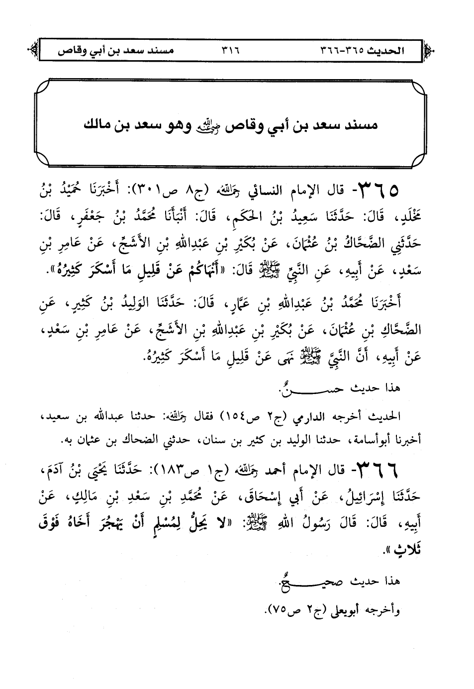 365 - قال الإمام النسائي رحمه الله (ج 8 ص 301): أَخْبَرَنَا حُمَيْدُ بْنُ مَخْلَدٍ قَالَ حَدَّثَنَا سَعِيدُ بْنُ الْحَكَمِ قَالَ أَنْبَأَنَا مُحَمَّدُ بْنُ جَعْفَرٍ قَالَ حَدَّثَنِي الضَّحَّاكُ بْنُ عُثْمَانَ عَنْ بُكَيْرِ بْنِ عَبْدِ اللهِ بْنِ الْأَشَجِّ عَنْ عَامِرِ بْنِ سَعْدٍ عَنْ أَبِيهِ: عَنْ النَّبِيِّ صَلَّى اللهُ عَلَيْهِ وَعَلَى آلِهِ وَسَلَّمَ قَالَ «أَنْهَاكُمْ عَنْ قَلِيلِ مَا أَسْكَرَ كَثِيرُهُ».