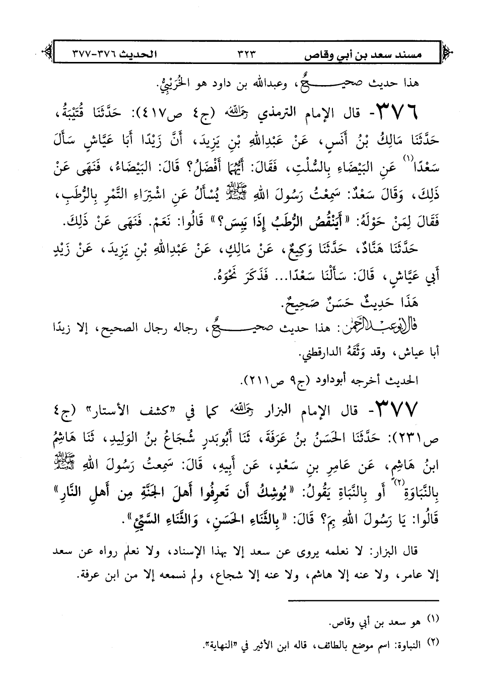 376 - قال الإمام الترمذي رحمه الله (ج 4 ص 417): حَدَّثَنَا قُتَيْبَةُ حَدَّثَنَا مَالِكُ بْنُ أَنَسٍ عَنْ عَبْدِ اللهِ بْنِ يَزِيدَ: أَنَّ زَيْدًا أَبَا عَيَّاشٍ سَأَلَ سَعْدًا (1) عَنْ الْبَيْضَاءِ بِالسُّلْتِ فَقَالَ أَيُّهُمَا أَفْضَلُ قَالَ الْبَيْضَاءُ فَنَهَى عَنْ ذَلِكَ وَقَالَ سَعْدٌ: سَمِعْتُ رَسُولَ اللهِ صَلَّى اللهُ عَلَيْهِ وَعَلَى آلِهِ وَسَلَّمَ يُسْأَلُ عَنْ اشْتِرَاءِ التَّمْرِ بِالرُّطَبِ فَقَالَ لِمَنْ حَوْلَهُ «أَيَنْقُصُ الرُّطَبُ إِذَا يَبِسَ؟ » قَالُوا نَعَمْ فَنَهَى عَنْ ذَلِكَ.