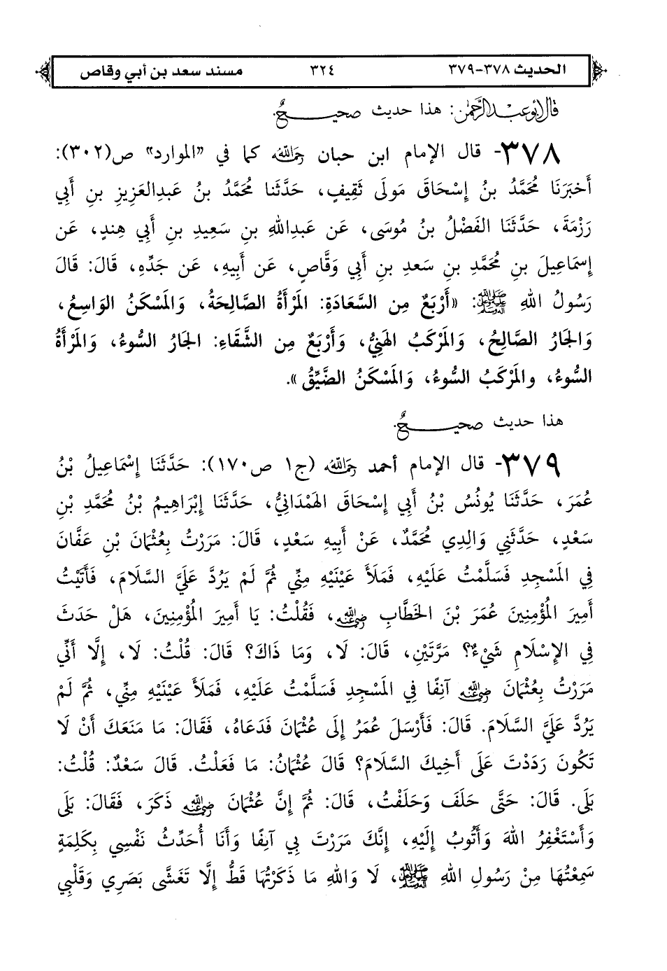 378 - قال الإمام ابن حبان رحمه الله كما في "الموارد" (ص 302): أخبرنا محمد بن إسحاق مولى ثقيف حدثنا محمد بن عبد العزيز بن أبي رزمة حدثنا الفضل بن موسى عن عبد الله بن سعيد بن أبي هند عن إسماعيل بن محمد بن سعد بن أبي وقاص عن أبيه عن جده قال: قال رسول الله صلى الله عليه وعلى آله وسلم «أربع من السعادة المرأة الصالحة والمسكن الواسع والجار الصالح والمركب الهني وأربع من الشقاء الجار السوء والمرأة السوء والمركب السوء والمسكن الضيق».
