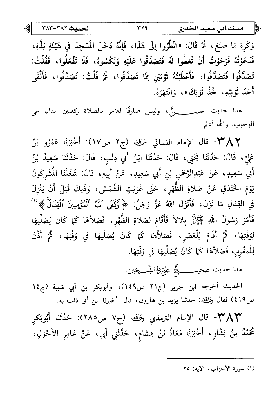 382 - قال الإمام النسائي رحمه الله (ج 2 ص 17): أَخْبَرَنَا عَمْرُو بْنُ عَلِيٍّ قَالَ حَدَّثَنَا يَحْيَى قَالَ حَدَّثَنَا ابْنُ أَبِي ذِئْبٍ قَالَ حَدَّثَنَا سَعِيدُ بْنُ أَبِي سَعِيدٍ عَنْ عَبْدِ الرَّحْمَنِ بْنِ أَبِي سَعِيدٍ عَنْ أَبِيهِ قَالَ: شَغَلَنَا الْمُشْرِكُونَ يَوْمَ الْخَنْدَقِ عَنْ صَلَاةِ الظُّهْرِ حَتَّى غَرَبَتْ الشَّمْسُ وَذَلِكَ قَبْلَ أَنْ يَنْزِلَ فِي الْقِتَالِ مَا نَزَلَ فَأَنْزَلَ اللهُ عَزَّ وَجَلَّ: {وَكَفَى اللهُ الْمُؤْمِنِينَ الْقِتَالَ} (1) فَأَمَرَ رَسُولُ اللهِ صَلَّى اللهُ عَلَيْهِ وَعَلَى آلِهِ وَسَلَّمَ بِلَالًا فَأَقَامَ لِصَلَاةِ الظُّهْرِ فَصَلَّاهَا كَمَا كَانَ يُصَلِّيهَا لِوَقْتِهَا ثُمَّ أَقَامَ لِلْعَصْرِ فَصَلَّاهَا كَمَا كَانَ يُصَلِّيهَا فِي وَقْتِهَا ثُمَّ أَذَّنَ لِلْمَغْرِبِ فَصَلَّاهَا كَمَا كَانَ يُصَلِّيهَا فِي وَقْتِهَا.
