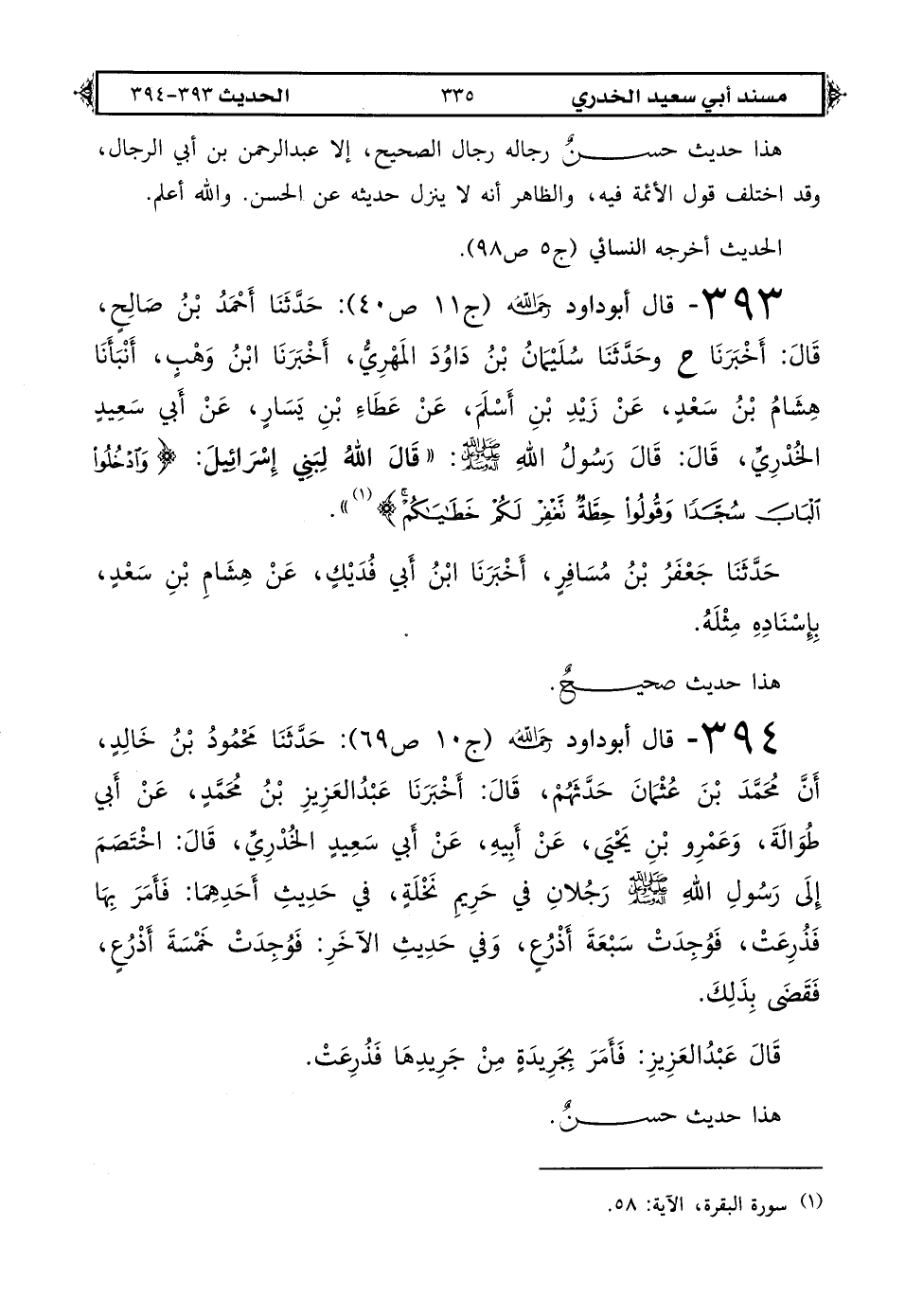 393 - قال أبو داود رحمه الله (ج 11 ص 40): حَدَّثَنَا أَحْمَدُ بْنُ صَالِحٍ قَالَ أخبرَنَا ح وحَدَّثَنَا سُلَيْمَانُ بْنُ دَاوُدَ الْمَهْرِيُّ أَخْبَرَنَا ابْنُ وَهْبٍ أَنبأَنَا هِشَامُ بْنُ سَعْدٍ عَنْ زَيْدِ بْنِ أَسْلَمَ عَنْ عَطَاءِ بْنِ يَسَارٍ عَنْ أَبِي سَعِيدٍ الْخُدْرِيِّ قَالَ: قَالَ رَسُولُ اللهِ صَلَّى اللهُ عَلَيْهِ وَعَلَى آلِهِ وَسَلَّمَ «قَالَ اللهُ لِبَنِي إِسْرَائِيلَ {ادْخُلُوا الْبَابَ سُجَّدًا وَقُولُوا حِطَّةٌ تُغْفَرْ لَكُمْ خَطَايَاكُمْ} (1)».