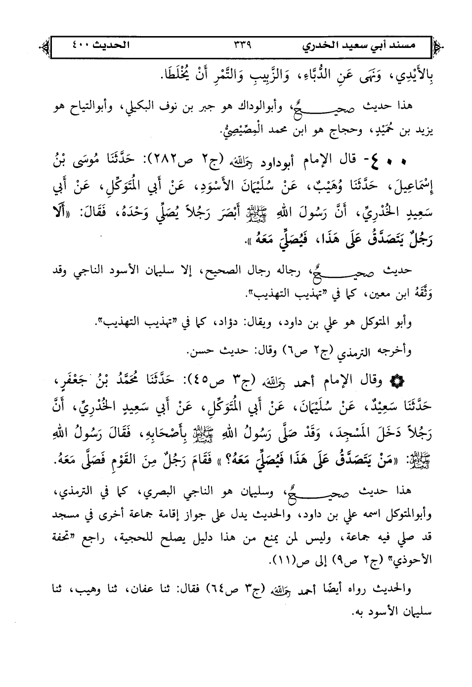 400 - قال الإمام أبو داود رحمه الله (ج 2 ص 282): حَدَّثَنَا مُوسَى بْنُ إِسْمَاعِيلَ حَدَّثَنَا وُهَيْبٌ عَنْ سُلَيْمَانَ الْأَسْوَدِ عَنْ أَبِي الْمُتَوَكِّلِ عَنْ أَبِي سَعِيدٍ الْخُدْرِيِّ: أَنَّ رَسُولَ اللهِ صَلَّى اللهُ عَلَيْهِ وَعَلَى آلِهِ وَسَلَّمَ أَبْصَرَ رَجُلًا يُصَلِّي وَحْدَهُ فَقَالَ «أَلَا رَجُلٌ يَتَصَدَّقُ عَلَى هَذَا فَيُصَلِّيَ مَعَهُ».