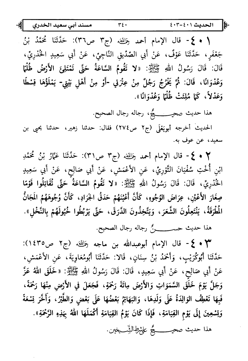 401 - قال الإمام أحمد رحمه الله (ج 3 ص 36): حَدَّثَنَا مُحَمَّدُ بْنُ جَعْفَرٍ، حَدَّثَنَا عَوْفٌ، عَنْ أَبِي الصِّدِّيقِ النَّاجِيِّ، عَنْ أَبِي سَعِيدٍ الْخُدْرِيِّ، قَالَ: قَالَ رَسُولُ اللهِ صَلَّى اللهُ عَلَيْهِ وعلى آله وَسَلَّمَ: «لَا تَقُومُ السَّاعَةُ حَتَّى تَمْتَلِئَ الْأَرْضُ ظُلْمًا وَعُدْوَانًا، قَالَ: ثُمَّ يَخْرُجُ رَجُلٌ مِنْ عِتْرَتِي -أَوْ مِنْ أَهْلِ بَيْتِي- يَمْلَؤُهَا قِسْطًا وَعَدْلًا، كَمَا مُلِئَتْ ظُلْمًا وَعُدْوَانًا».