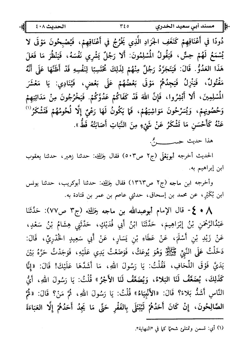 408 - قال الإمام أبو عبد الله بن ماجه رحمه الله (ج 3 ص 77): حَدَّثَنَا عَبْدُ الرَّحْمَنِ بْنُ إِبْرَاهِيمَ حَدَّثَنَا ابْنُ أَبِي فُدَيْكٍ حَدَّثَنِي هِشَامُ بْنُ سَعْدٍ عَنْ زَيْدِ بْنِ أَسْلَمَ عَنْ عَطَاءِ بْنِ يَسَارٍ عَنْ أَبِي سَعِيدٍ الْخُدْرِيِّ قَالَ: دَخَلْتُ عَلَى النَّبِيِّ صَلَّى اللهُ عَلَيْهِ وَعَلَى آلِهِ وَسَلَّمَ وَهُوَ يُوعَكُ فَوَضَعْتُ يَدِي عَلَيْهِ فَوَجَدْتُ حَرَّهُ بَيْنَ يَدَيَّ فَوْقَ اللِّحَافِ فَقُلْتُ يَا رَسُولَ اللهِ مَا أَشَدَّهَا عَلَيْكَ قَالَ «إِنَّا كَذَلِكَ يُضَعَّفُ لَنَا الْبَلَاءُ وَيُضَعَّفُ لَنَا الْأَجْرُ» قُلْتُ يَا رَسُولَ اللهِ أَيُّ النَّاسِ أَشَدُّ بَلَاءً قَالَ «الْأَنْبِيَاءُ» قُلْتُ يَا رَسُولَ اللهِ ثُمَّ مَنْ قَالَ «ثُمَّ الصَّالِحُونَ إِنْ كَانَ أَحَدُهُمْ لَيُبْتَلَى بِالْفَقْرِ حَتَّى مَا يَجِدُ أَحَدُهُمْ إِلَّا الْعَبَاءَةَ [ص: 346] يُحَوِّيهَا وَإِنْ كَانَ أَحَدُهُمْ لَيَفْرَحُ بِالْبَلَاءِ كَمَا يَفْرَحُ أَحَدُكُمْ بِالرَّخَاءِ».