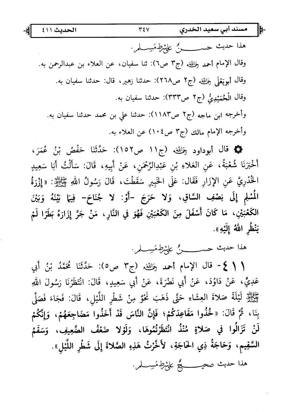 411 - قال الإمام أحمد رحمه الله (ج 3 ص 5): حَدَّثَنَا مُحَمَّدُ بْنُ أَبِي عَدِيٍّ عَنْ دَاوُدَ عَنْ أَبِي نَضْرَةَ عَنْ أَبِي سَعِيدٍ قَالَ: انْتَظَرْنَا رَسُولَ اللهِ صَلَّى اللهُ عَلَيْهِ وَعَلَى آلِهِ وَسَلَّمَ لَيْلَةً صَلَاةَ الْعِشَاءِ حَتَّى ذَهَبَ نَحْوٌ مِنْ شَطْرِ اللَّيْلِ قَالَ فَجَاءَ فَصَلَّى بِنَا ثُمَّ قَالَ «خُذُوا مَقَاعِدَكُمْ فَإِنَّ النَّاسَ قَدْ أَخَذُوا مَضَاجِعَهُمْ وَإِنَّكُمْ لَنْ تَزَالُوا فِي صَلَاةٍ مُنْذُ انْتَظَرْتُمُوهَا وَلَوْلَا ضَعْفُ الضَّعِيفِ وَسَقَمُ السَّقِيمِ وَحَاجَةُ ذِي الْحَاجَةِ لَأَخَّرْتُ هَذِهِ الصَّلَاةَ إِلَى شَطْرِ اللَّيْلِ».