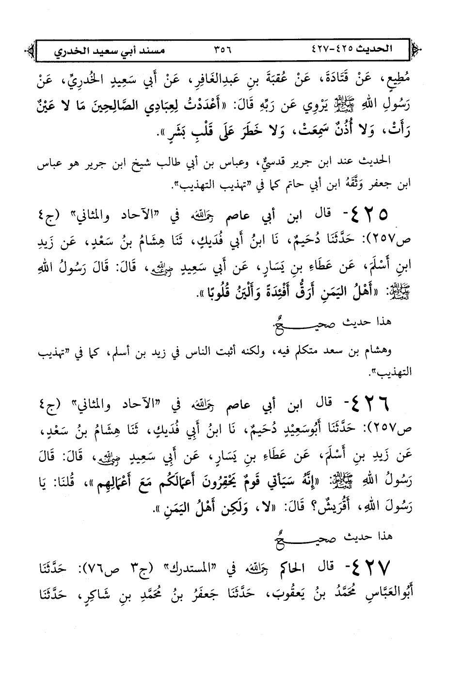 425 - قال ابن أبي عاصم رحمه الله في "الآحاد والمثاني" (ج 4 ص 257): حدثنا دحيم، نا ابن أبي فديك، ثنا هشام بن سعد، عن زيد بن أسلم، عن عطاء بن يسار، عن أبي سعيد رضي الله عنه، قال: قال رسول الله صلى الله عليه وعلى آله وسلم: «أهل اليمن أرق أفئدة وألين قلوبًا».