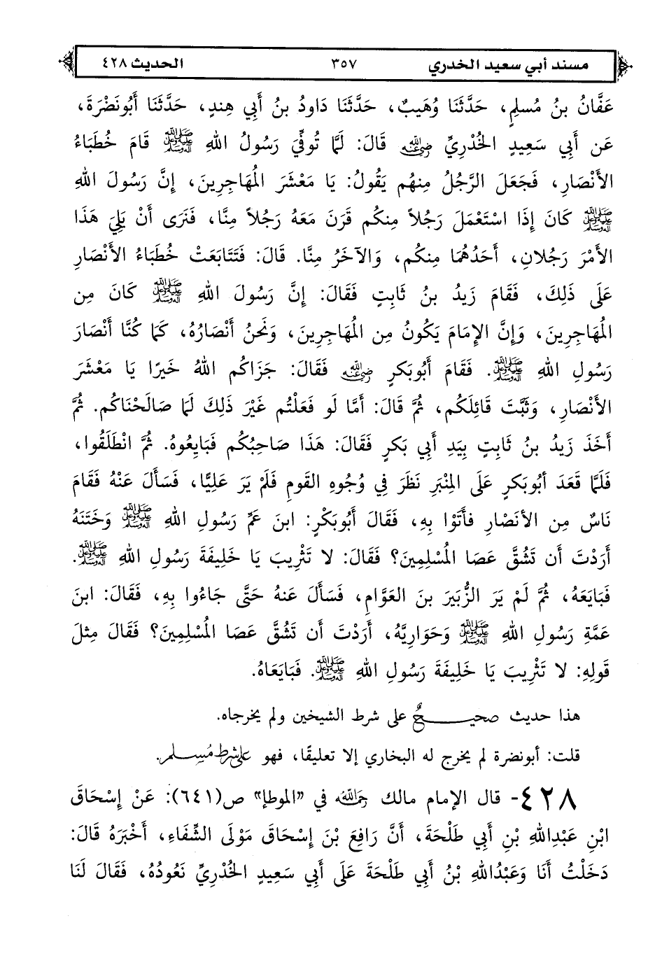 428 - قال الإمام مالك رحمه الله في "الموطأ" (ص 641): عَنْ إِسْحَاقَ ابْنِ عَبْدِ اللهِ بْنِ أَبِي طَلْحَةَ أَنَّ رَافِعَ بْنَ إِسْحَاقَ مَوْلَى الشِّفَاءِ أَخْبَرَهُ قَالَ: دَخَلْتُ أَنَا وَعَبْدُ اللهِ بْنُ أَبِي طَلْحَةَ عَلَى أَبِي سَعِيدٍ الْخُدْرِيِّ نَعُودُهُ فَقَالَ لَنَا [ص: 358] أَبُو سَعِيدٍ: أَخْبَرَنَا رَسُولُ اللهِ صَلَّى اللهُ عَلَيْهِ وَعَلَى آلِهِ وَسَلَّمَ «أَنَّ الْمَلَائِكَةَ لَا تَدْخُلُ بَيْتًا فِيهِ تَمَاثِيلُ -أَوْ صُورَةٌ-». شَكَّ إِسْحَاقُ لَا يَدْرِي أَيُّهُمَا قَالَ أَبُو سَعِيدٍ.