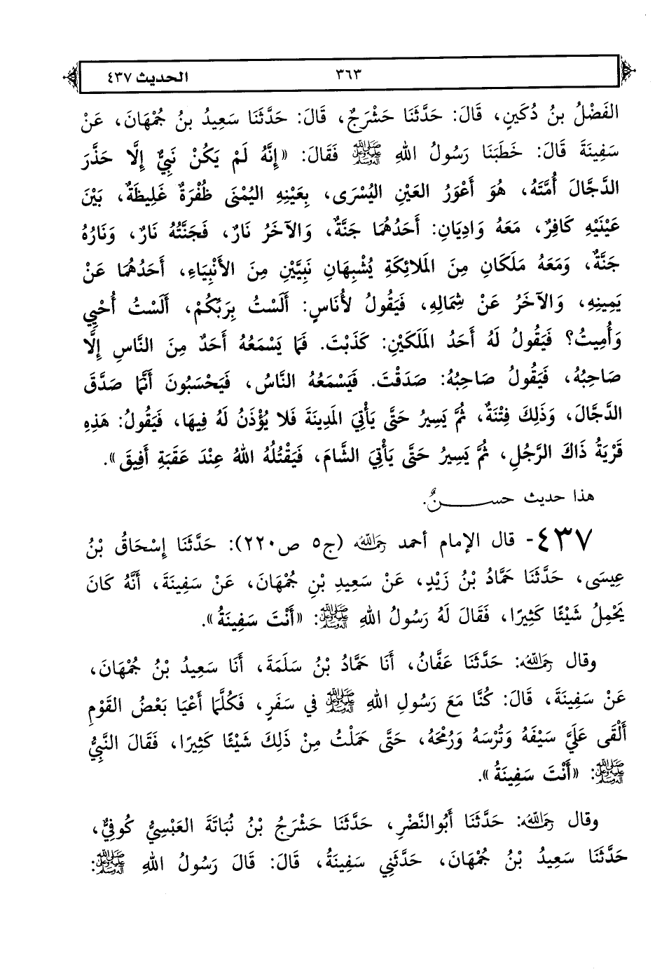 437 - قال الإمام أحمد رحمه الله (ج 5 ص 220): حَدَّثَنَا إِسْحَاقُ بْنُ عِيسَى حَدَّثَنَا حَمَّادُ بْنُ زَيْدٍ عَنْ سَعِيدِ بْنِ جُمْهَانَ عَنْ سَفِينَةَ: أَنَّهُ كَانَ يَحْمِلُ شَيْئًا كَثِيرًا فَقَالَ لَهُ رَسُولُ اللهِ صَلَّى اللهُ عَلَيْهِ وَعَلَى آلِهِ وَسَلَّمَ «أَنْتَ سَفِينَةُ».
