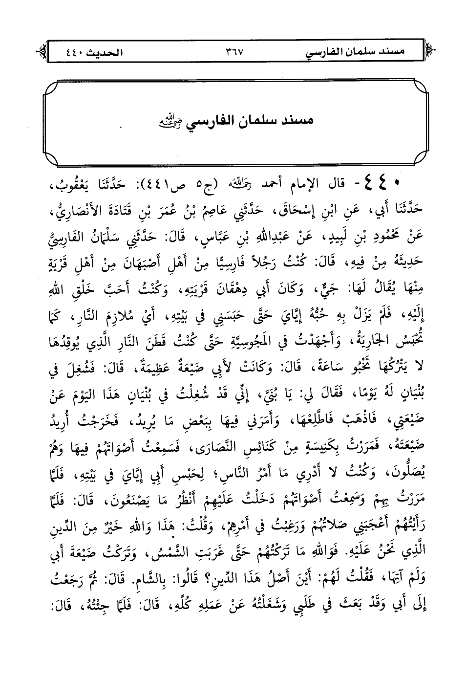 440 - قال الإمام أحمد رحمه الله (ج 5 ص 441): حَدَّثَنَا يَعْقُوبُ حَدَّثَنَا أَبِي عَنِ ابْنِ إِسْحَاقَ حَدَّثَنِي عَاصِمُ بْنُ عُمَرَ بْنِ قَتَادَةَ الْأَنْصَارِيُّ عَنْ مَحْمُودِ بْنِ لَبِيدٍ عَنْ عَبْدِ اللهِ بْنِ عَبَّاسٍ قَالَ حَدَّثَنِي سَلْمَانُ الْفَارِسِيُّ حَدِيثَهُ مِنْ فِيهِ قَالَ: كُنْتُ رَجُلًا فَارِسِيًّا مِنْ أَهْلِ أَصْبَهَانَ مِنْ أَهْلِ قَرْيَةٍ مِنْهَا يُقَالُ لَهَا جَيٌّ وَكَانَ أَبِي دِهْقَانَ قَرْيَتِهِ وَكُنْتُ أَحَبَّ خَلْقِ اللهِ إِلَيْهِ فَلَمْ يَزَلْ بِهِ حُبُّهُ إِيَّايَ حَتَّى حَبَسَنِي فِي بَيْتِهِ أَيْ مُلَازِمَ النَّارِ كَمَا تُحْبَسُ الْجَارِيَةُ وَأَجْهَدْتُ فِي الْمَجُوسِيَّةِ حَتَّى كُنْتُ قَطَنَ النَّارِ الَّذِي يُوقِدُهَا لَا يَتْرُكُهَا تَخْبُو سَاعَةً قَالَ وَكَانَتْ لِأَبِي ضَيْعَةٌ عَظِيمَةٌ قَالَ فَشُغِلَ فِي بُنْيَانٍ لَهُ يَوْمًا فَقَالَ لِي يَا بُنَيَّ إِنِّي قَدْ شُغِلْتُ فِي بُنْيَانٍ هَذَا الْيَوْمَ عَنْ ضَيْعَتِي فَاذْهَبْ فَاطَّلِعْهَا وَأَمَرَنِي فِيهَا بِبَعْضِ مَا يُرِيدُ فَخَرَجْتُ أُرِيدُ ضَيْعَتَهُ فَمَرَرْتُ بِكَنِيسَةٍ مِنْ كَنَائِسِ النَّصَارَى فَسَمِعْتُ أَصْوَاتَهُمْ فِيهَا وَهُمْ يُصَلُّونَ وَكُنْتُ لَا أَدْرِي مَا أَمْرُ النَّاسِ لِحَبْسِ أَبِي إِيَّايَ فِي بَيْتِهِ فَلَمَّا مَرَرْتُ بِهِمْ وَسَمِعْتُ أَصْوَاتَهُمْ دَخَلْتُ عَلَيْهِمْ أَنْظُرُ مَا يَصْنَعُونَ قَالَ فَلَمَّا رَأَيْتُهُمْ أَعْجَبَنِي صَلَاتُهُمْ وَرَغِبْتُ فِي أَمْرِهِمْ وَقُلْتُ هَذَا وَاللهِ خَيْرٌ مِنْ الدِّينِ الَّذِي نَحْنُ عَلَيْهِ فَوَاللهِ مَا تَرَكْتُهُمْ حَتَّى غَرَبَتْ الشَّمْسُ وَتَرَكْتُ ضَيْعَةَ أَبِي وَلَمْ آتِهَا فَقُلْتُ لَهُمْ أَيْنَ أَصْلُ هَذَا الدِّينِ قَالُوا بِالشَّامِ قَالَ ثُمَّ رَجَعْتُ إِلَى أَبِي وَقَدْ بَعَثَ فِي طَلَبِي وَشَغَلْتُهُ عَنْ عَمَلِهِ كُلِّهِ قَالَ فَلَمَّا جِئْتُهُ قَالَ [ص: 368] أَيْ بُنَيَّ أَيْنَ كُنْتَ أَلَمْ أَكُنْ عَهِدْتُ إِلَيْكَ مَا عَهِدْتُ قَالَ قُلْتُ يَا أَبَتِ مَرَرْتُ بِنَاسٍ يُصَلُّونَ فِي كَنِيسَةٍ لَهُمْ فَأَعْجَبَنِي مَا رَأَيْتُ مِنْ دِينِهِمْ فَوَاللهِ مَازِلْتُ عِنْدَهُمْ حَتَّى غَرَبَتْ الشَّمْسُ قَالَ أَيْ بُنَيَّ لَيْسَ فِي ذَلِكَ الدِّينِ خَيْرٌ دِينُكَ وَدِينُ آبَائِكَ خَيْرٌ مِنْهُ قَالَ قُلْتُ كَلَّا وَاللهِ إِنَّهُ خَيْرٌ مِنْ دِينِنَا قَالَ فَخَافَنِي فَجَعَلَ فِي رِجْلَيَّ قَيْدًا ثُمَّ حَبَسَنِي فِي بَيْتِهِ قَالَ وَبَعَثَتُ إِلَى النَّصَارَى فَقُلْتُ لَهُمْ إِذَا قَدِمَ عَلَيْكُمْ رَكْبٌ مِنْ الشَّامِ تُجَّارٌ مِنْ النَّصَارَى فَأَخْبِرُونِي بِهِمْ قَالَ فَقَدِمَ عَلَيْهِمْ رَكْبٌ مِنْ الشَّامِ تُجَّارٌ مِنْ النَّصَارَى قَالَ فَأَخْبَرُونِي بِهِمْ قَالَ فَقُلْتُ لَهُمْ إِذَا قَضَوْا حَوَائِجَهُمْ وَأَرَادُوا الرَّجْعَةَ إِلَى بِلَادِهِمْ فَآذِنُونِي بِهِمْ قَالَ فَلَمَّا أَرَادُوا الرَّجْعَةَ إِلَى بِلَادِهِمْ أَخْبَرُونِي بِهِمْ فَأَلْقَيْتُ الْحَدِيدَ مِنْ رِجْلَيَّ ثُمَّ خَرَجْتُ مَعَهُمْ حَتَّى قَدِمْتُ الشَّامَ.