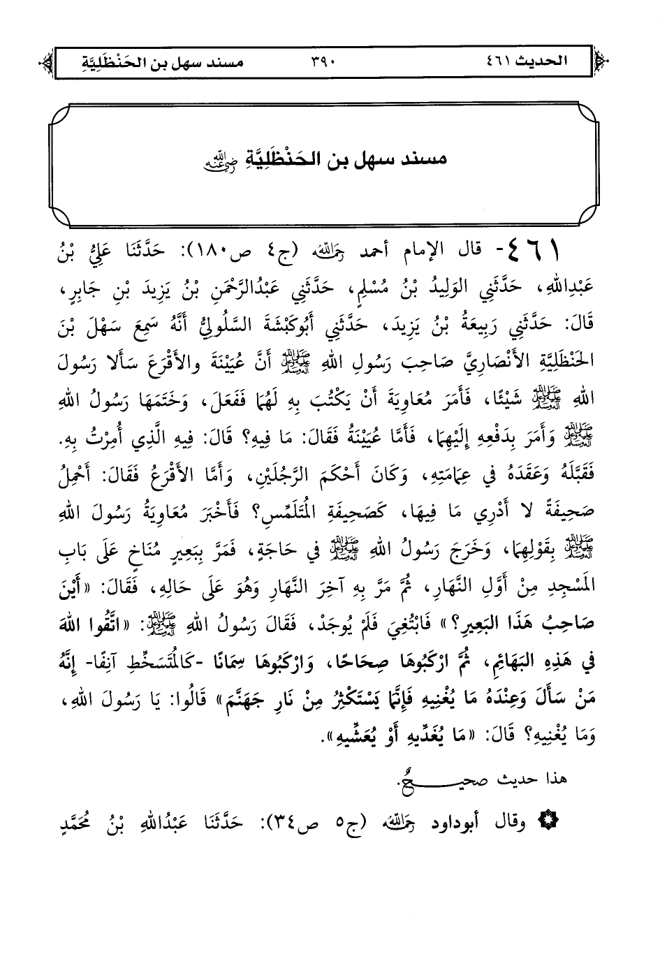 461 - قال الإمام أحمد رحمه الله (ج 4 ص 180): حدثنا علي بن عبد الله حدثني الوليد بن مسلم حدثني عبد الرحمن بن يزيد بن جابر قال حدثني ربيعة بن يزيد حدثني أبو كبشة السلولي أنه سمع سهل بن الحنظلية الأنصاري صاحب رسول الله صلى الله عليه وعلى آله وسلم: أن عيينة والأقرع سألا رسول الله صلى الله عليه وعلى آله وسلم شيئًا فأمر معاوية أن يكتب به لهما ففعل وختمها رسول الله صلى الله عليه وعلى آله وسلم وأمر بدفعه إليهما فأما عيينة فقال ما فيه قال فيه الذي أُمرتُ به فقبَّله وعقده في عمامته -وكان أحكم الرجلين- وأما الأقرع فقال أحمل صحيفة لا أدري ما فيها كصحيفة المتلمس فأخبر معاوية رسول الله صلى الله عليه وعلى آله وسلم بقولهما وخرج رسول الله صلى الله عليه وعلى آله وسلم في حاجة فمر ببعير مناخ على باب المسجد من أول النهار ثم مر به آخر النهار وهو على حاله فقال «أين صاحب هذا البعير؟ » فابتغي فلم يوجد فقال رسول الله صلى الله عليه وعلى آله وسلم «اتقوا الله في هذه البهائم ثم اركبوها صحاحًا واركبوها سمانًا -كالمتسخط آنفًا- إنه من سأل وعنده ما يغنيه فإنما يستكثر من نار جهنم» قالوا يا رسول الله وما يغنيه قال «ما يغديه أو يعشيه».