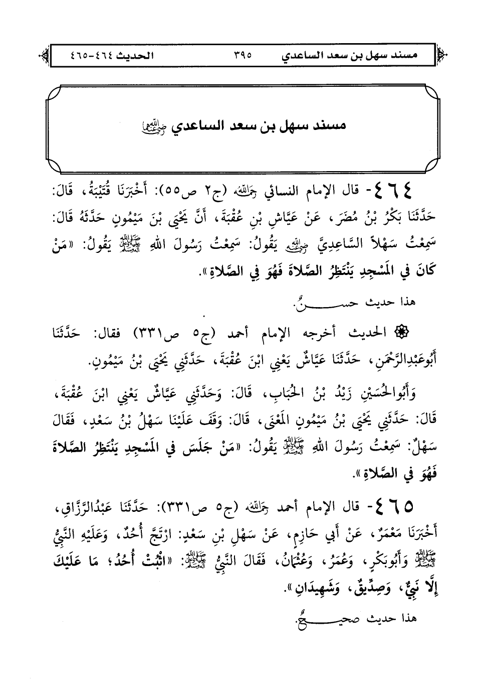 464 - قال الإمام النسائي رحمه الله (ج 2 ص 55): أَخْبَرَنَا قُتَيْبَةُ قَالَ حَدَّثَنَا بَكْرُ بْنُ مُضَرَ عَنْ عَيَّاشِ بْنِ عُقْبَةَ أَنَّ يَحْيَى بْنَ مَيْمُونٍ حَدَّثَهُ قَالَ سَمِعْتُ سَهْلًا السَّاعِدِيِّ رَضِيَ اللهُ عَنْهُ يَقُولُ: سَمِعْتُ رَسُولَ اللهِ صَلَّى اللهُ عَلَيْهِ وَعَلَى آلِهِ وَسَلَّمَ يَقُولُ «مَنْ كَانَ فِي الْمَسْجِدِ يَنْتَظِرُ الصَّلَاةَ فَهُوَ فِي الصَّلَاةِ».
