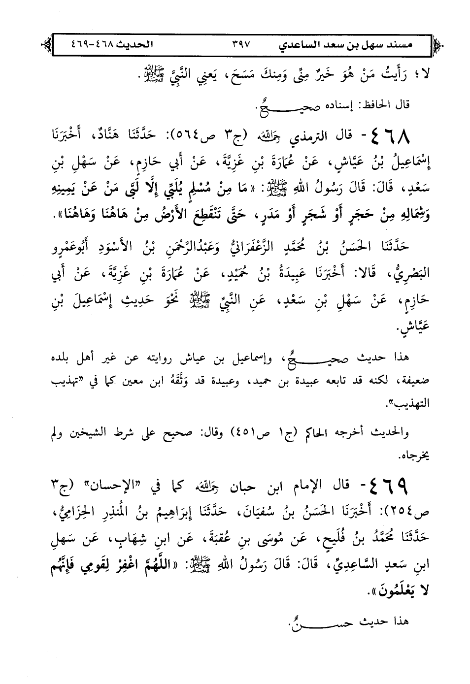 469 - قال الإمام ابن حبان رحمه الله كما في "الإحسان" (ج 3 ص 254): أخبرنا الحسن بن سفيان حدثنا إبراهيم بن المنذر الحزامي حدثنا محمد بن فليح عن موسى بن عقبة عن ابن شهاب عن سهل بن سعد الساعدي قال: قال رسول الله صلى الله عليه وعلى آله وسلم «اللهم اغفر لقومي فإنهم لا يعلمون».