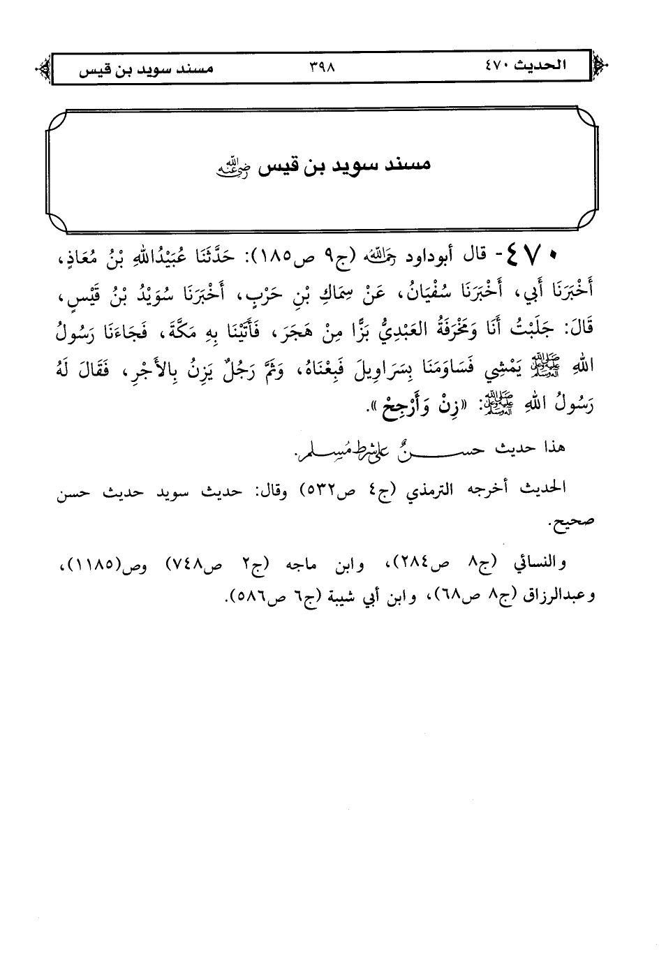 470 - قال أبو داود رحمه الله (ج 9 ص 185): حدثنا عبيد الله بن معاذ أخبرنا أبي أخبرنا سفيان عن سماك بن حرب أخبرنا سويد بن قيس قال: جلبت أنا ومخرفة العبدي بزًّا من هجر فأتينا به مكة فجاءنا رسول الله صلى الله عليه وعلى آله وسلم يمشي فساومنا بسراويل فبعناه وثم رجل يزن بالأجر فقال له رسول الله صلى الله عليه وعلى آله وسلم «زن وأرجح».