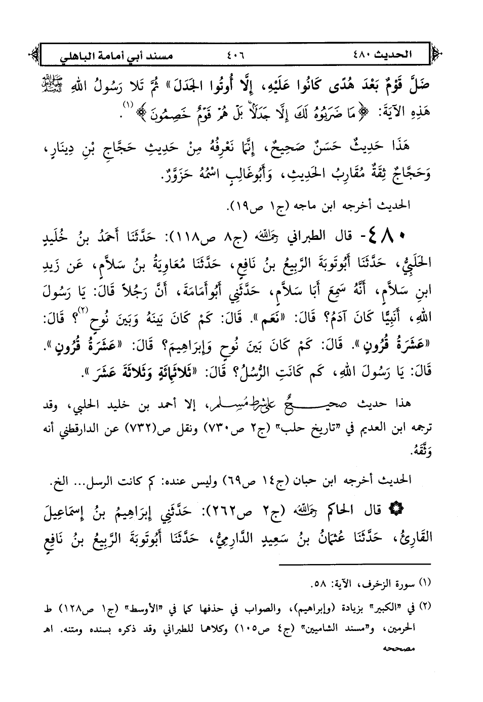 480 - قال الطبراني رحمه الله (ج 8 ص 118): حدثنا أحمد بن خليد الحلبي حدثنا أبو توبة الربيع بن نافع حدثنا معاوية بن سلام عن زيد بن سلام أنه سمع أبا سلام حدثني أبو أمامة: أن رجلًا قال: يا رسول الله أنبيًّا كان آدم؟ قال: «نعم» قال: كم كان بينه وبين نوح (1)؟ قال: «عشرة قرون» قال: كم كان بين نوح وإبراهيم؟ قال: «عشرة قرون» قال: يا رسول الله كم كانت الرسل؟ قال: «ثلاثمائة وثلاثة عشر».