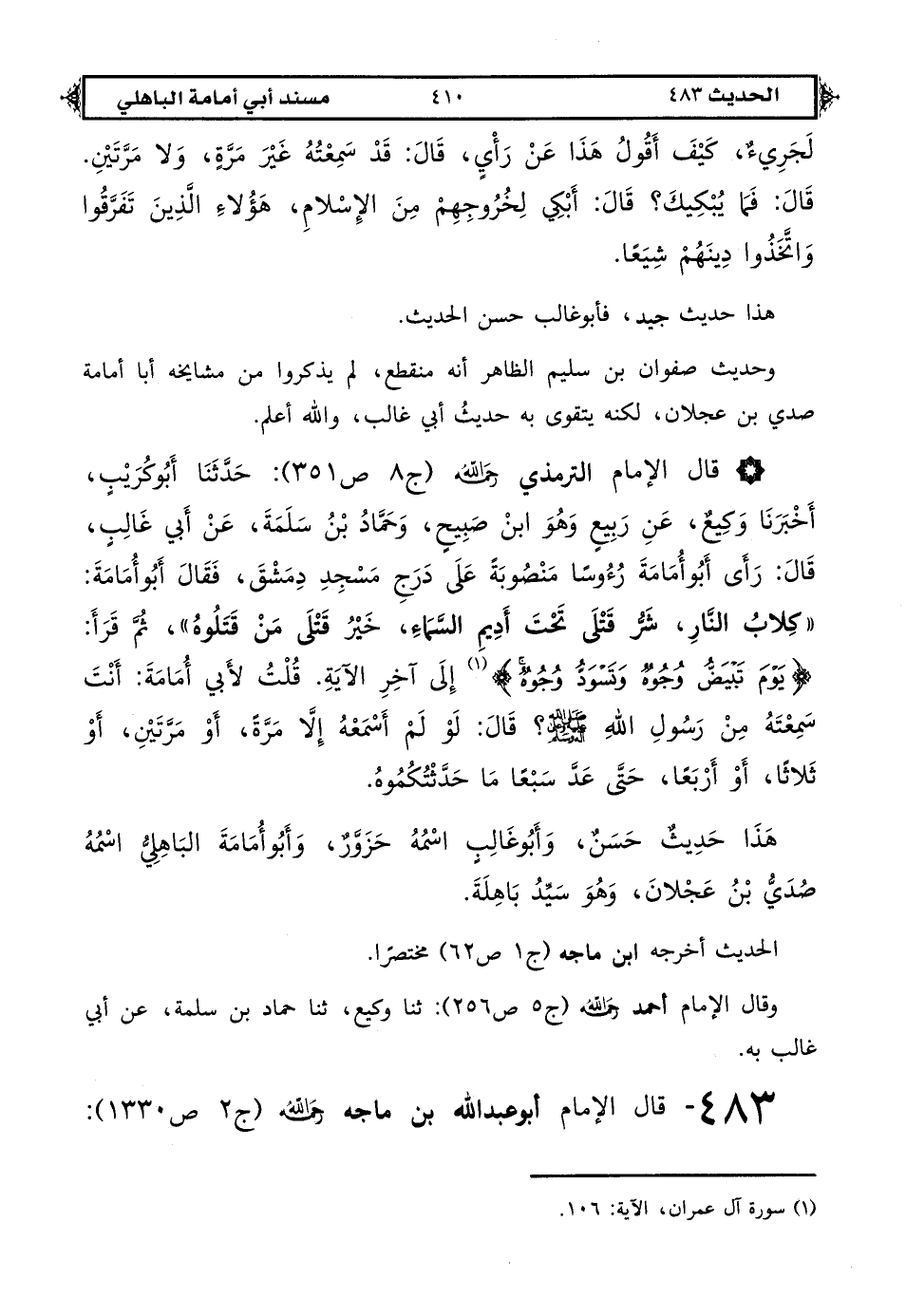 483 - قال الإمام أبو عبد الله بن ماجه رحمه الله (ج 2 ص 1330): [ص: 411] حَدَّثَنَا رَاشِدُ بْنُ سَعِيدٍ الرَّمْلِيُّ حَدَّثَنَا الْوَلِيدُ بْنُ مُسْلِمٍ حَدَّثَنَا حَمَّادُ بْنُ سَلَمَةَ عَنْ أَبِي غَالِبٍ عَنْ أَبِي أُمَامَةَ قَالَ: عَرَضَ لِرَسُولِ اللهِ صَلَّى اللهُ عَلَيْهِ وَعَلَى آلِهِ وَسَلَّمَ رَجُلٌ عِنْدَ الْجَمْرَةِ الْأُولَى فَقَالَ يَا رَسُولَ اللهِ أَيُّ الْجِهَادِ أَفْضَلُ فَسَكَتَ عَنْهُ فَلَمَّا رَأَى (1) الْجَمْرَةَ الثَّانِيَةَ سَأَلَهُ فَسَكَتَ عَنْهُ فَلَمَّا رَمَى جَمْرَةَ الْعَقَبَةِ وَضَعَ رِجْلَهُ فِي الْغَرْزِ لِيَرْكَبَ قَالَ «أَيْنَ السَّائِلُ؟ » قَالَ أَنَا يَا رَسُولَ اللهِ قَالَ «كَلِمَةُ حَقٍّ عِنْدَ ذِي سُلْطَانٍ جَائِرٍ».