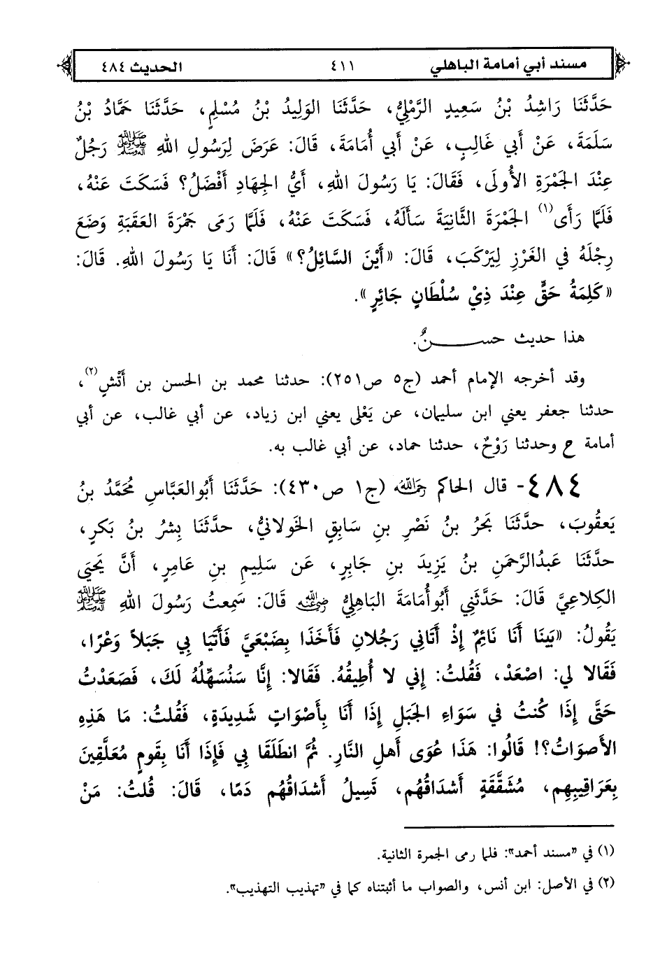 484 - قال الحاكم رحمه الله (ج 1 ص 430): حدثنا أبو العباس محمد بن يعقوب، حدثنا بحر بن نصر بن سابق الخولاني، حدثنا بشر بن بكر، حدثنا عبد الرحمن بن يزيد بن جابر، عن سليم بن عامر أبي يحيى الكلاعي، قال: حدثني أبو أمامة الباهلي رضي الله عنه، قال: سمعت رسول الله صلى الله عليه وعلى آله وسلم يقول: «بينا أنا نائم، إذ أتاني رجلان فأخذا بضبعي فأتيا بي جبلًا وعرًا، فقالا لي: اصعد. فقلت: إني لا أطيقه. فقالا: إنا سنسهله لك. فصعدت، حتى إذا كنت في سواء الجبل إذا أنا بأصوات شديدة، فقلت: ما هذه الأصوات؟ قالوا: هذا عوى أهل النار. ثم انطلقا بي، فإذا أنا بقوم معلقين بعراقيبهم، مشققة أشداقهم تسيل أشداقهم دمًا، قال: قلت: من [ص: 412] هؤلاء؟ قال: هؤلاء الذين يفطرون قبل تحلة صومهم».