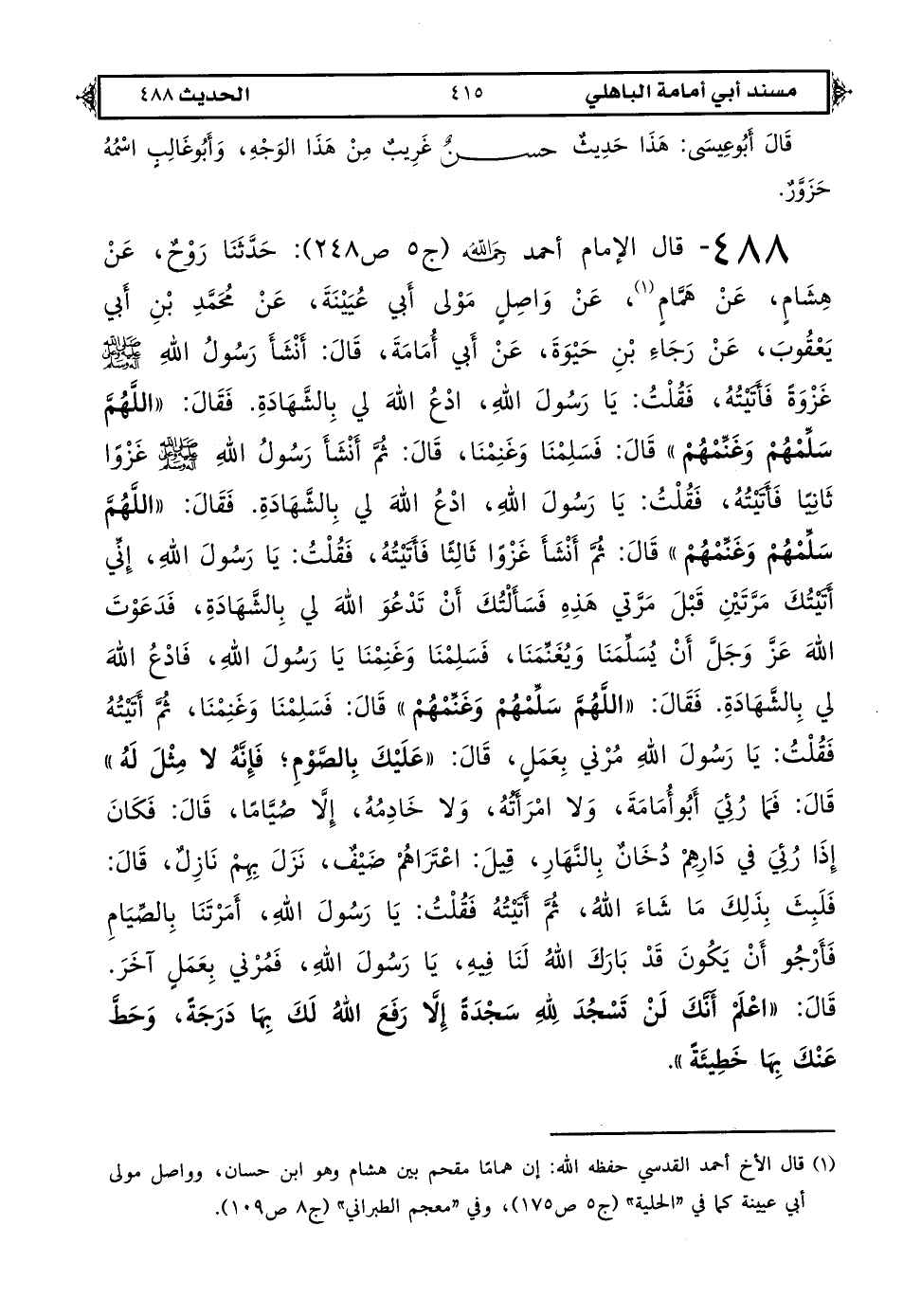 488 - قال الإمام أحمد رحمه الله (ج 5 ص 248): حدثنا روح عن هشام عن همام (1) عن واصل مولى أبي عيينة عن محمد بن أبي يعقوب عن رجاء بن حيوة عن أبي أمامة قال: أنشأ رسول الله صلى الله عليه وعلى آله وسلم غزوة فأتيته فقلت يا رسول الله ادع الله لي بالشهادة فقال «اللهم سلمهم وغنمهم» قال فسلمنا وغنمنا قال ثم أنشأ رسول الله صلى الله عليه وعلى آله وسلم غزوًا ثانيًا فأتيته فقلت يا رسول الله ادع الله لي بالشهادة فقال «اللهم سلمهم وغنمهم» قال ثم أنشأ غزوًا ثالثًا فأتيته فقلت يا رسول الله إني أتيتك مرتين قبل مرتي هذه فسألتك أن تدعو الله لي بالشهادة فدعوت الله عز وجل أن يسلمنا ويغنمنا فسلمنا وغنمنا يا رسول الله فادع الله لي بالشهادة فقال «اللهم سلمهم وغنمهم» قال فسلمنا وغنمنا ثم أتيته فقلت يا رسول الله مرني بعمل قال «عليك بالصوم فإنه لامثل له» قال فما رئي أبو أمامة ولا امرأته ولا خادمه إلا صيامًا قال فكان إذا رئي في دارهم دخان بالنهار قيل اعتراهم ضيف نزل بهم نازل قال فلبث بذلك ما شاء الله ثم أتيته فقلت يا رسول الله أمرتنا بالصيام فأرجو أن يكون قد بارك الله لنا فيه يا رسول الله فمرني بعمل آخر قال «اعلم أنك لن تسجد لله سجدة إلا رفع الله لك بها درجة وحط عنك بها خطيئة».