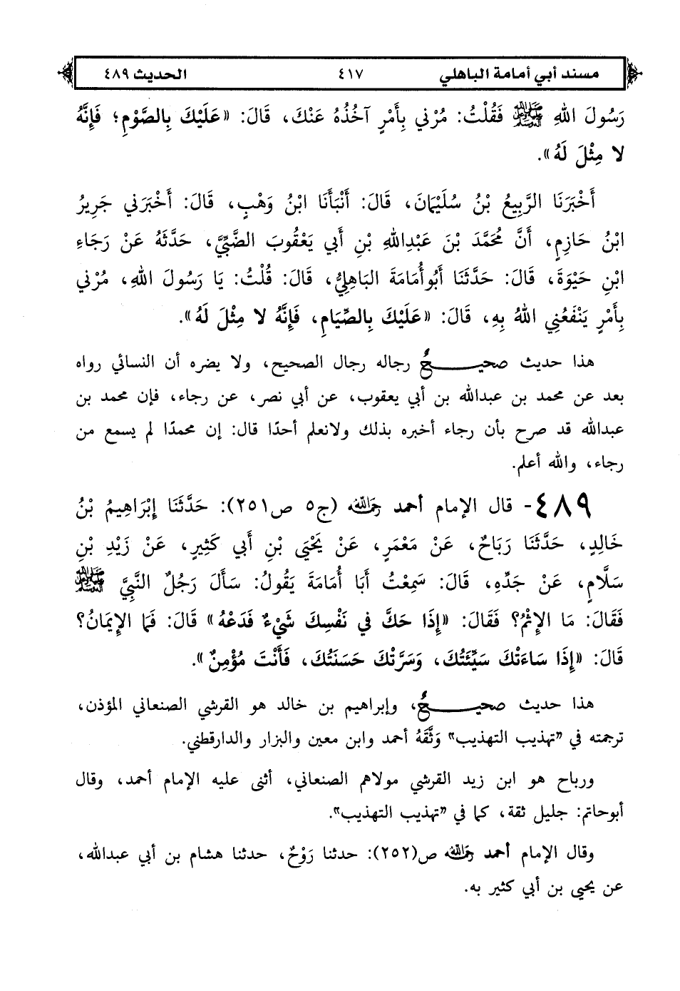 489 - قال الإمام أحمد رحمه الله (ج 5 ص 251): حدثنا إبراهيم بن خالد حدثنا رباح عن معمر عن يحيى بن أبي كثير عن زيد بن سلام عن جده قال سمعت أبا أمامة يقول: سأل رجل النبي صلى الله عليه وعلى آله وسلم فقال ما الإثم فقال «إذا حك في نفسك شيء فدعه» قال فما الإيمان قال «إذا ساءتك سيئتك وسرتك حسنتك فأنت مؤمن».