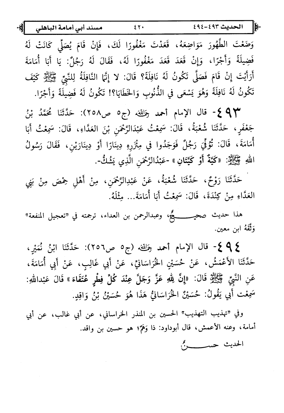 494 - قال الإمام أحمد رحمه الله (ج 5 ص 256): حدثنا ابن نمير حدثنا الأعمش عن حسين الخرساني عن أبي غالب عن أبي أمامة: عن النبي صلى الله عليه وعلى آله وسلم قال «إن لله عز وجل عند كل فطر عتقاء». قال عبد الله: سمعت أبي يقول حسين الخرساني هذا هو حسين بن واقد.