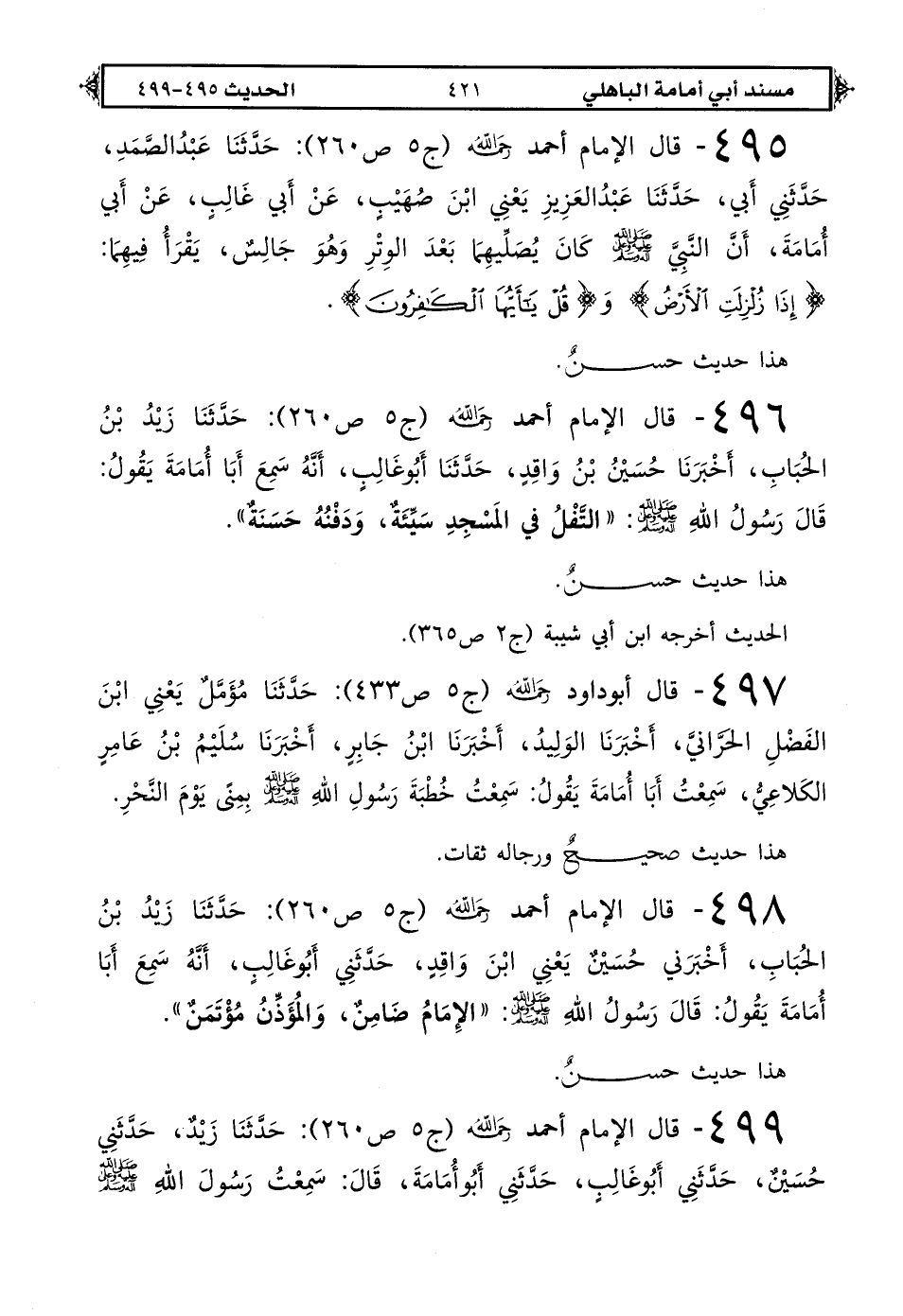 498 - قال الإمام أحمد رحمه الله (ج 5 ص 260): حدثنا زيد بن الحباب أخبرني حسين يعني ابن واقد حدثني أبو غالب أنه سمع أبا أمامة يقول: قال رسول الله صلى الله عليه وعلى آله وسلم «الإمام ضامن والمؤذن مؤتمن».