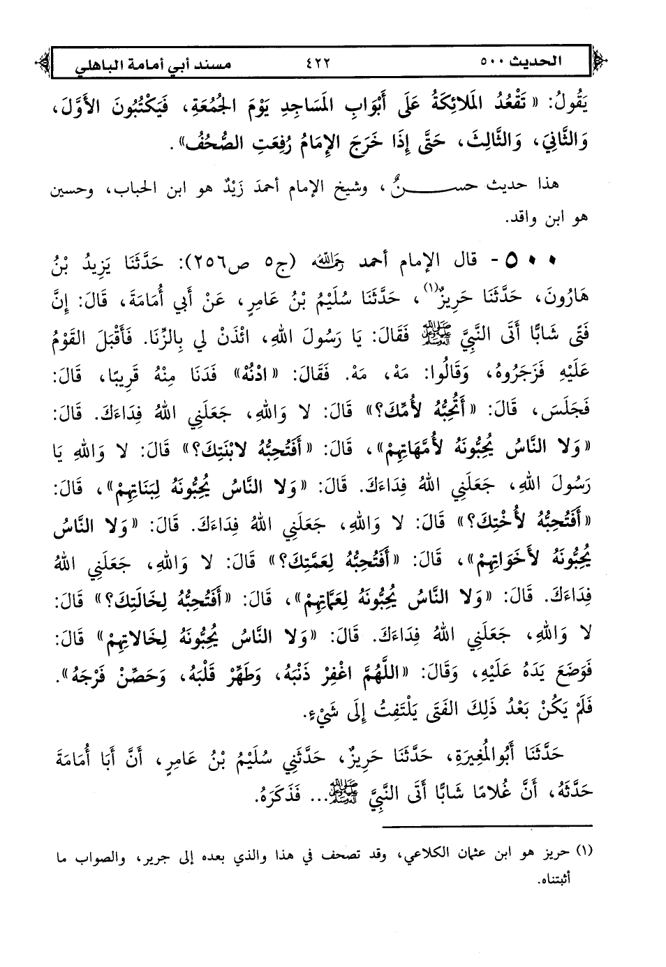 500 - قال الإمام أحمد رحمه الله (ج 5 ص 256): حدثنا يزيد بن هارون حدثنا حريز (1) حدثنا سليم بن عامر عن أبي أمامة قال: إن فتى شابًّا أتى النبي صلى الله عليه وعلى آله وسلم فقال يا رسول الله ائذن لي بالزنا فأقبل القوم عليه فزجروه وقالوا مه مه فقال «ادنه» فدنا منه قريبًا قال فجلس قال «أتحبه لأمك؟ » قال لا والله جعلني الله فداءك قال «ولا الناس يحبونه لأمهاتهم» قال «أفتحبه لابنتك؟ » قال لا والله يا رسول الله جعلني الله فداءك قال «ولا الناس يحبونه لبناتهم» قال «أفتحبه لأختك؟ » قال لا والله جعلني الله فداءك قال «ولا الناس يحبونه لأخواتهم» قال «أفتحبه لعمتك؟ » قال لا والله جعلني الله فداءك قال «ولا الناس يحبونه لعماتهم» قال «أفتحبه لخالتك؟ » قال لا والله جعلني الله فداءك قال «ولا الناس يحبونه لخالاتهم» قال فوضع يده عليه وقال «اللهم اغفر ذنبه وطهر قلبه وحصن فرجه» فلم يكن بعد ذلك الفتى يلتفت إلى شيء.