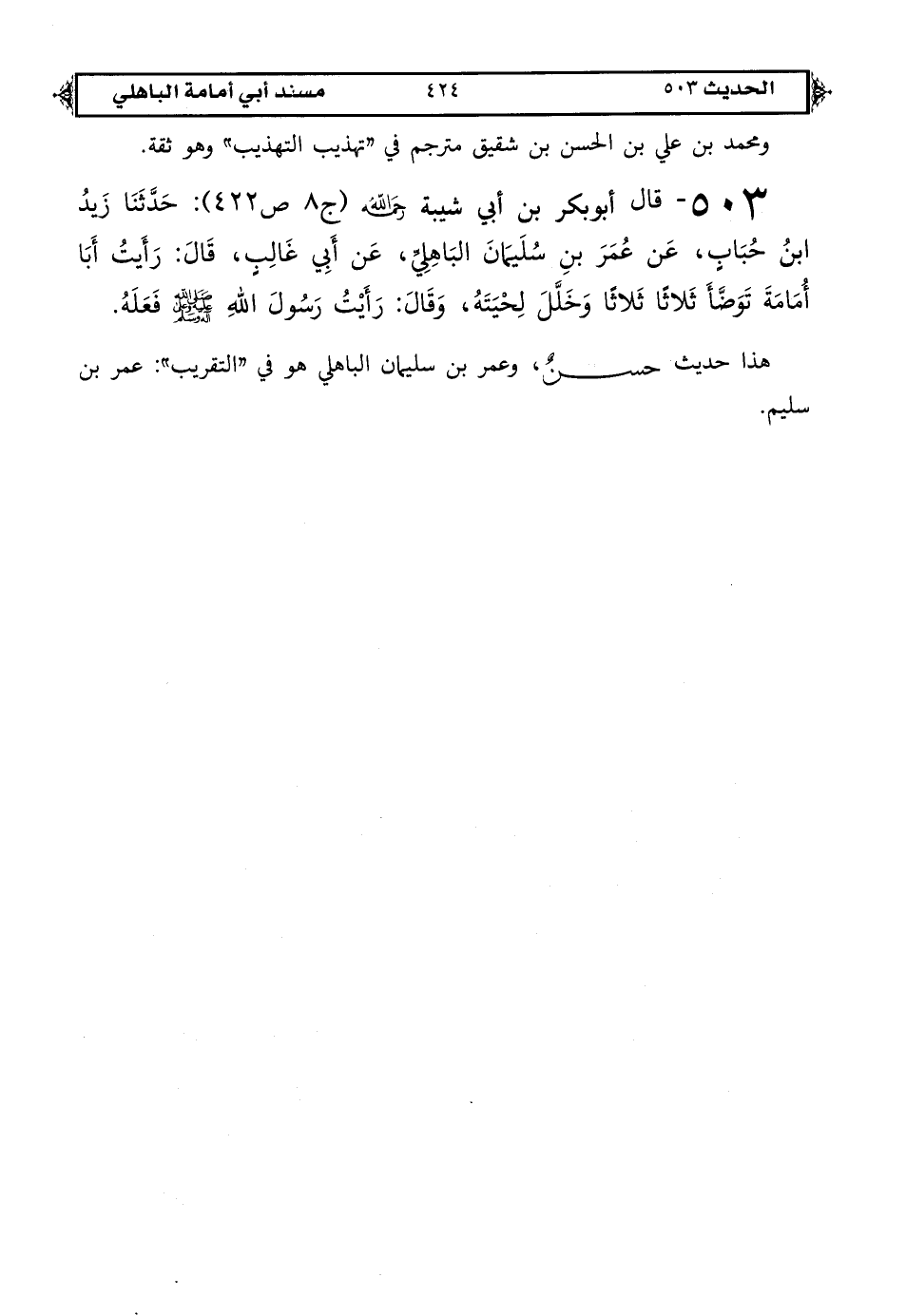 503 - قال أبو بكر ابن أبي شيبة (ج 8 ص 422): حَدَّثَنَا زَيْدُ بْنُ حُبَابٍ، عَنْ عُمَرَ بْنِ سُلَيْمَانَ الْبَاهِلِيِّ، عَنْ أَبِي غَالِبٍ، قَالَ: رَأَيْتُ أَبَا أُمَامَةَ تَوَضَّأَ ثَلَاثًا ثَلَاثًا، وَخَلَّلَ لِحْيَتَهُ، وَقَالَ: رَأَيْتُ رَسُولَ اللهِ صلى الله عليه وعلى آله وسلم فَعَلَهُ.