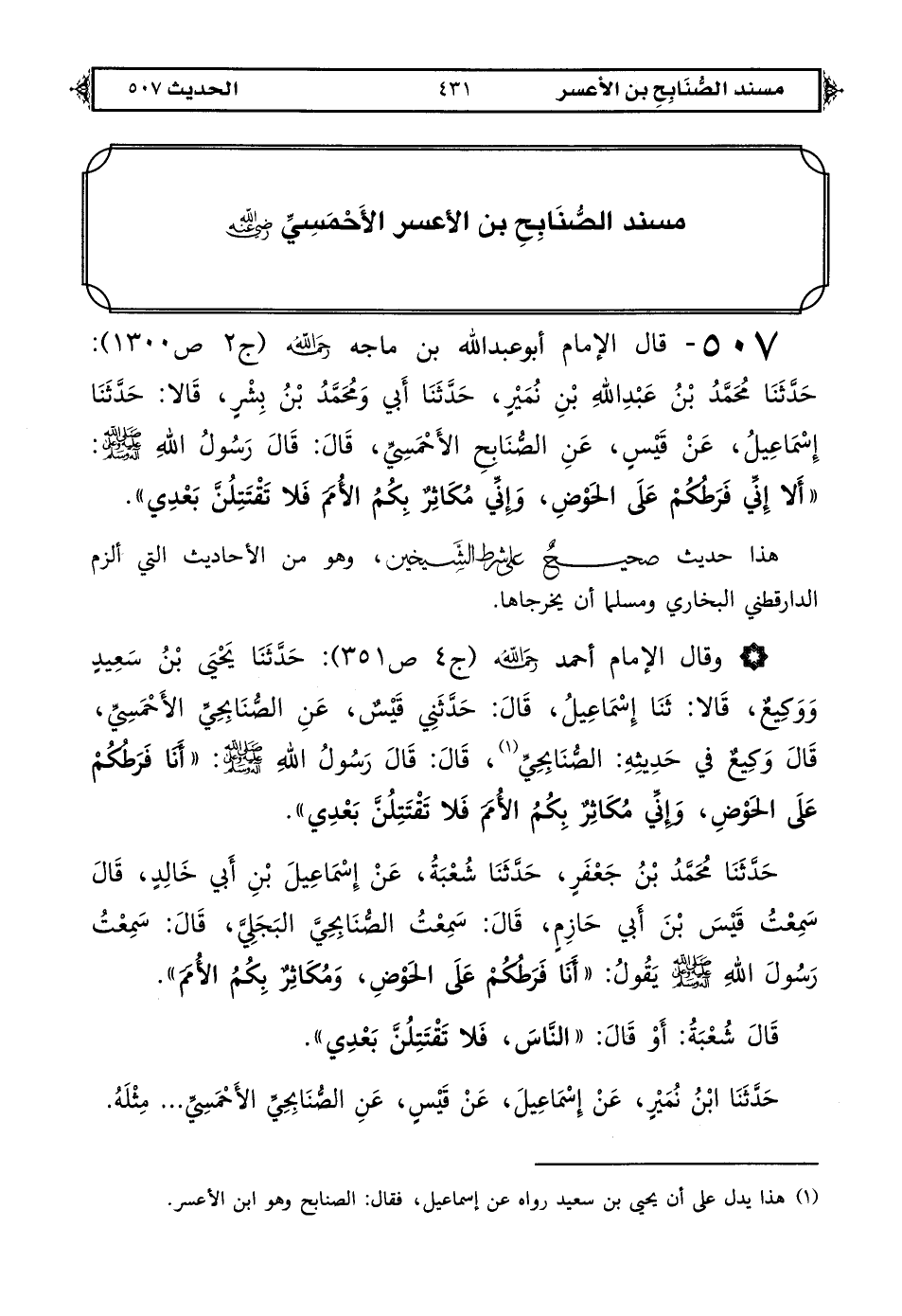 507 - قال الإمام أبو عبد الله بن ماجه رحمه الله (ج 2 ص 1300): حدثنا محمد بن عبد الله بن نمير حدثنا أبي ومحمد بن بشر قالا حدثنا إسماعيل عَنْ قَيْسٍ عن الصُّنَابِحِ الأَحْمَسِيِّ قال: قال رَسُولُ الله صلى الله عليه وعلى آله وسلم: «أَلَا إِنِّي فَرَطُكُمْ عَلَى الْحَوْضِ وَإِنِّى مُكَاثِرٌ بِكُمُ الأُمَمَ فَلَا تَقْتَتِلُنَّ بَعْدِي».