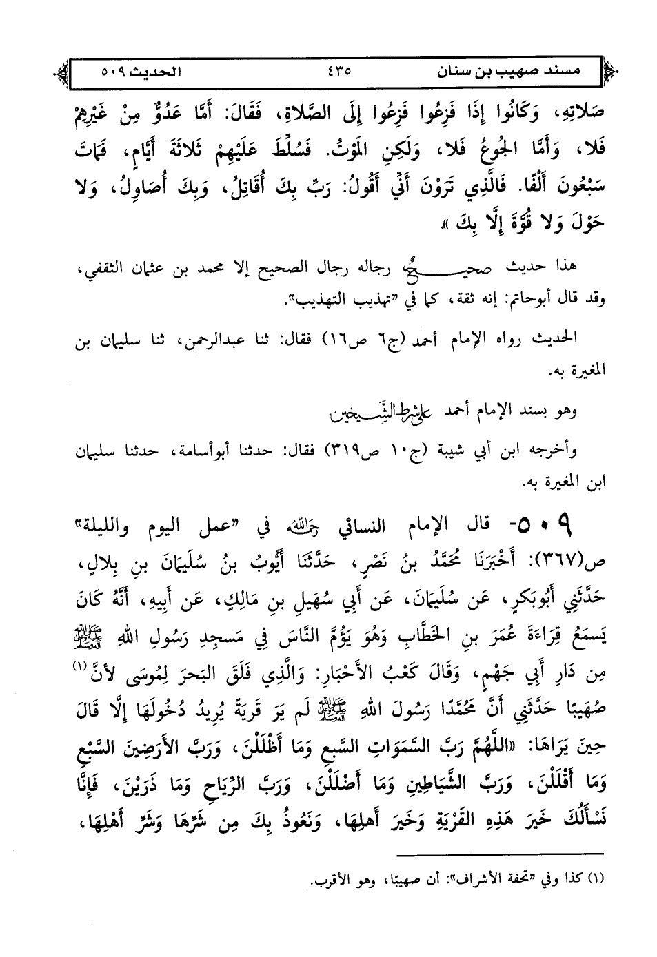 509 - قال الإمام النسائي رحمه الله في "عمل اليوم والليلة" (ص 367): أخبرنا محمد بن نصر حدثنا أيوب بن سليمان بن بلال حدثني أبو بكر عن سليمان عن أبي سهيل بن مالك عن أبيه: أنه كان يسمع قراءة عمر بن الخطاب وهو يؤم الناس في مسجد رسول الله صلى الله عليه وعلى آله وسلم من دار أبي جهم وقال كعب الأحبار والذي فلق البحر لموسى لأن (1) صهيبًا حدثني: أن محمدًا رسول الله صلى الله عليه وعلى آله وسلم لم ير قرية يريد دخولها إلا قال حين يراها «اللهم رب السموات السبع وما أظللن ورب الأرضين السبع وما أقللن ورب الشياطين وما أضللن ورب الرياح وما ذرين فإنا نسألك خير هذه القرية وخير أهلها ونعوذ بك من شرها وشر أهلها [ص: 436] وشر ما فيها» وحلف كعب بالذي فلق البحر لموسى لأنها كانت دعوات داود حين يرى العدو.