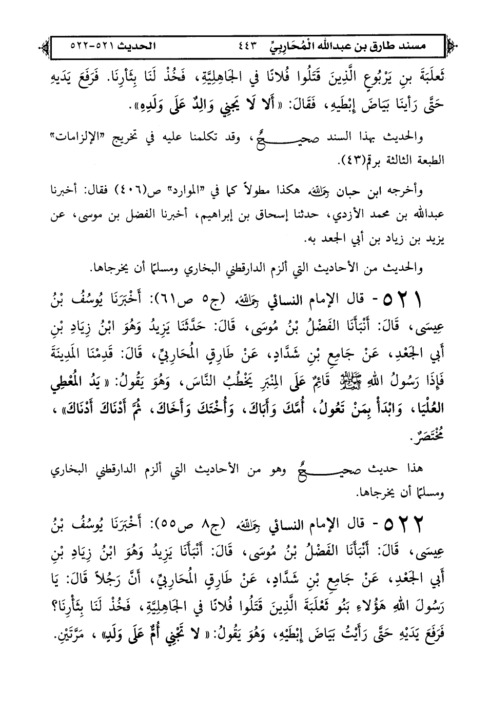 522 - قال الإمام النسائي رحمه الله (ج 8 ص 55): أَخْبَرَنَا يُوسُفُ بْنُ عِيسَى قَالَ أَنْبَأَنَا الْفَضْلُ بْنُ مُوسَى قَالَ أَنْبَأَنَا يَزِيدُ وَهُوَ ابْنُ زِيَادِ بْنِ أَبِي الْجَعْدِ عَنْ جَامِعِ بْنِ شَدَّادٍ عَنْ طَارِقٍ الْمُحَارِبِيِّ: أَنَّ رَجُلًا قَالَ يَا رَسُولَ اللهِ هَؤُلَاءِ بَنُو ثَعْلَبَةَ الَّذِينَ قَتَلُوا فُلَانًا فِي الْجَاهِلِيَّةِ فَخُذْ لَنَا بِثَأْرِنَا فَرَفَعَ يَدَيْهِ حَتَّى رَأَيْتُ بَيَاضَ إِبْطَيْهِ وَهُوَ يَقُولُ «لَا تَجْنِي أُمٌّ عَلَى وَلَدٍ» مَرَّتَيْنِ.