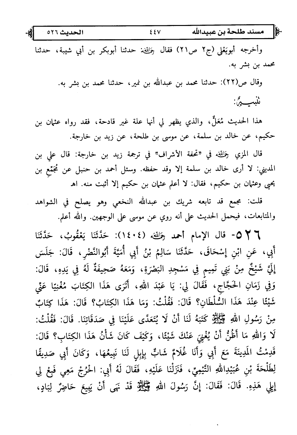 526 - قال الإمام أحمد رحمه الله (1404): حدثنا يعقوب حدثنا أبي عن ابن إسحاق حدثنا سالم بن أبي أمية أبو النضر قال: جلس إلي شيخ من بني تميم في مسجد البصرة ومعه صحيفة له في يده قال وفي زمان الحجاج فقال لي يا عبد الله أترى هذا الكتاب مغنيًا عني شيئًا عند هذا السلطان قال فقلت وما هذا الكتاب قال هذا كتاب من رسول الله صلى الله عليه وعلى آله وسلم كتبه لنا أن لا يتعدى علينا في صدقاتنا قال فقلت لا والله ما أظن أن يغني عنك شيئًا وكيف كان شأن هذا الكتاب قال قدمت المدينة مع أبي وأنا غلام شاب بإبل لنا نبيعها وكان أبي صديقًا لطلحة بن عبيد الله التيمي فنزلنا عليه فقال له أبي اخرج معي فبع لي إبلي هذه قال فقال: إن رسول الله صلى الله عليه وعلى آله وسلم قد نهى أن يبيع حاضر لباد [ص: 448] ولكن سأخرج معك فأجلس وتعرض إبلك فإذا رضيت من رجل وفاء وصدقًا ممن ساومك أمرتك ببيعه قال فخرجنا إلى السوق فوقفنا ظهرنا وجلس طلحة قريبًا فساومنا الرجال حتى إذا أعطانا رجل ما نرضى قال له أبي أبايعه قال نعم رضيت لكم وفاءه فبايعوه فبايعناه فلما قبضنا ما لنا وفرغنا من حاجتنا قال أبي لطلحة خذ لنا من رسول الله صلى الله عليه وعلى آله وسلم كتابًا أن لا يتعدى علينا في صدقاتنا قال فقال هذا لكم ولكل مسلم قال على ذلك إني أحب أن يكون عندي من رسول الله صلى الله عليه وعلى آله وسلم كتاب فخرج حتى جاء بنا إلى رسول الله صلى الله عليه وعلى آله وسلم فقال يا رسول الله إن هذا الرجل من أهل البادية صديق لنا وقد أحب أن تكتب له كتابًا لا يتعدى عليه في صدقته فقال رسول الله صلى الله عليه وعلى آله وسلم «هذا له ولكل مسلم» قال يا رسول الله إني قد أحب أن يكون عندي منك كتاب على ذلك قال فكتب لنا رسول الله صلى الله عليه وعلى آله وسلم هذا الكتاب.