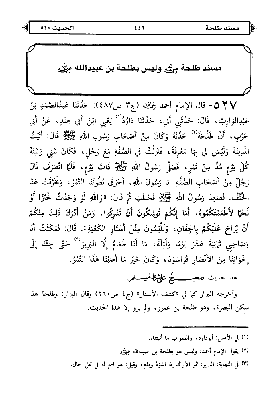 527 - قال الإمام أحمد رحمه الله (ج 3 ص 487): حدثنا عبد الصمد بن عبد الوارث قال حدثني أبي حدثنا داود (1) يعني ابن أبي هند عن أبي حرب أن طلحة (2) حدثه وكان من أصحاب رسول الله صلى الله عليه وعلى آله وسلم قال: أتيت المدينة وليس لي بها معرفة فنزلت في الصفة مع رجل فكان بيني وبينه كل يوم مد من تمر فصلى رسول الله صلى الله عليه وعلى آله وسلم ذات يوم فلما انصرف قال رجل من أصحاب الصفة يا رسول الله أحرق بطوننا التمر وتخرقت عنا الخنف فصعد رسول الله صلى الله عليه وعلى آله وسلم فخطب ثم قال «والله لو وجدت خبزًا أو لحمًا لأطعمتكموه أما إنكم توشكون أن تدركوا ومن أدرك ذلك منكم أن يراح عليكم بالجفان وتلبسون مثل أستار الكعبة» قال فمكثت أنا وصاحبي ثمانية عشر يومًا وليلة ما لنا طعام إلا البَرِيرَ (3) حتى جئنا إلى إخواننا من الأنصار فواسونا وكان خير ما أصبنا هذا التمر.