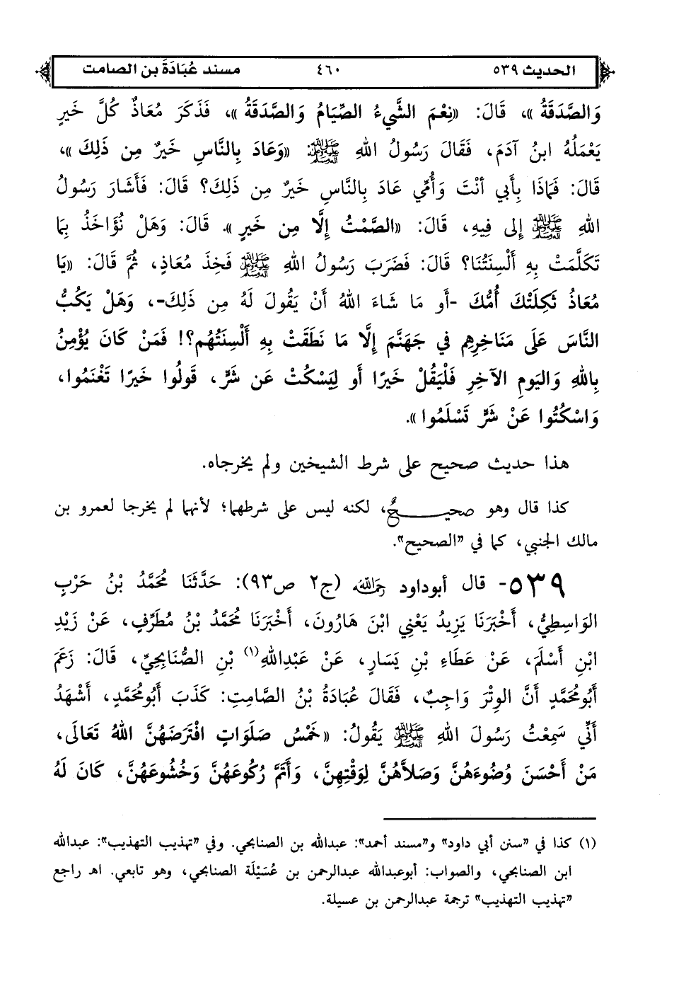 539 - قال أبو داود رحمه الله (ج 2 ص 93): حدثنا محمد بن حرب الواسطي أخبرنا يزيد يعني ابن هارون أخبرنا محمد بن مطرف عن زيد بن أسلم عن عطاء بن يسار عن عبد الله (1) بن الصنابحي قال: زعم أبو محمد أن الوتر واجب فقال عبادة بن الصامت: كذب أبو محمد أشهد أني سمعت رسول الله صلى الله عليه وعلى آله وسلم يقول «خمس صلوات افترضهن الله تعالى من أحسن وضوءهن وصلاهن لوقتهن وأتم ركوعهن وخشوعهن كان له [ص: 461] على الله عهد أن يغفر له ومن لم يفعل فليس له على الله عهد إن شاء غفر له وإن شاء عذبه».