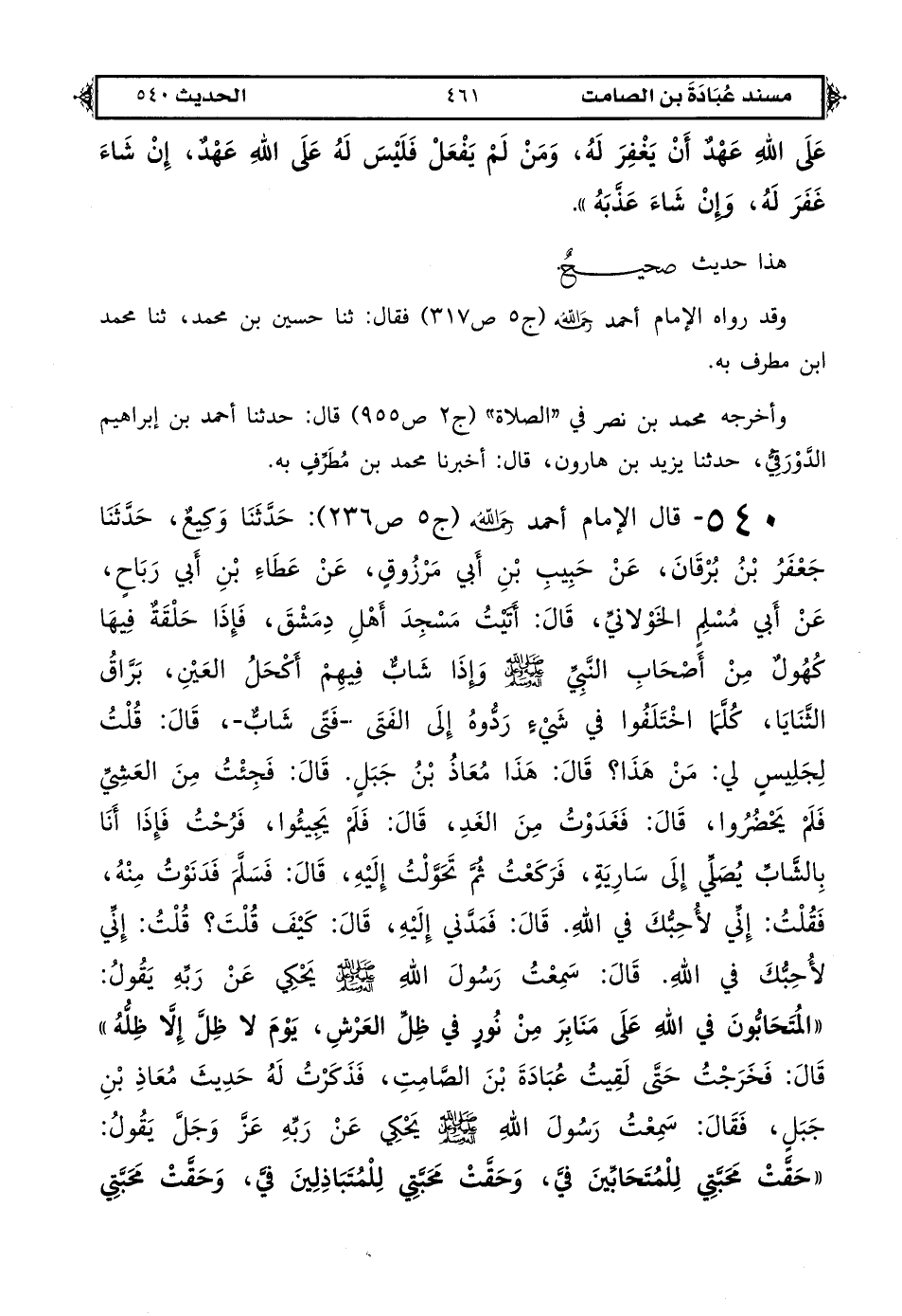 540 - قال الإمام أحمد رحمه الله (ج 5 ص 236): حدثنا وكيع حدثنا جعفر بن برقان عن حبيب بن أبي مرزوق عن عطاء بن أبي رباح عن أبي مسلم الخولاني قال: أتيت مسجد أهل دمشق فإذا حلقة فيها كهول من أصحاب النبي صلى الله عليه وعلى آله وسلم وإذا شاب فيهم أكحل العين براق الثنايا كلما اختلفوا في شيء ردوه إلى الفتى -فتى شاب- قال قلت لجليس لي من هذا قال هذا معاذ بن جبل قال فجئت من العشي فلم يحضروا قال فغدوت من الغد قال فلم يجيئوا فرحت فإذا أنا بالشاب يصلي إلى سارية فركعت ثم تحولت إليه قال فسلم فدنوت منه فقلت إني لأحبك في الله قال فمدني إليه قال كيف قلت قلت إني لأحبك في الله قال سمعت رسول الله صلى الله عليه وعلى آله وسلم يحكي عن ربه يقول «المتحابون في الله على منابر من نور في ظل العرش يوم لا ظل إلا ظله» قال فخرجت حتى لقيت عبادة بن الصامت فذكرت له حديث معاذ بن جبل فقال: سمعت رسول الله صلى الله عليه وعلى آله وسلم يحكي عن ربه عز وجل يقول «حقت محبتي للمتحابين في وحقت محبتي للمتباذلين في وحقت محبتي [ص: 462] للمتزاورين في والمتحابون في الله على منابر من نور في ظل العرش يوم لا ظل إلا ظله».