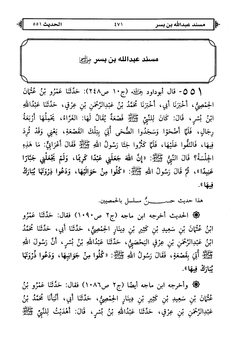 551 - قال أبو داود رحمه الله (ج 10 ص 248): حَدَّثَنَا عَمْرُو بْنُ عُثْمَانَ الْحِمْصِيُّ، أخبرَنَا أَبِي، أخبرَنَا مُحَمَّدُ بْنُ عَبْدِ الرَّحْمَنِ بْنِ عِرْقٍ، حَدَّثَنَا عَبْدُ اللهِ بْنُ بُسْرٍ، قَالَ: كَانَ لِلنَّبِيِّ صَلَّى اللهُ عَلَيْهِ وَعَلَى آلِهِ وَسَلَّمَ قَصْعَةٌ يُقَالُ لَهَا: الْغَرَّاءُ، يَحْمِلُهَا أَرْبَعَةُ رِجَالٍ، فَلَمَّا أَضْحَوْا وَسَجَدُوا الضُّحَى أُتِيَ بِتِلْكَ الْقَصْعَةِ -يَعْنِي وَقَدْ ثُرِدَ فِيهَا- فَالْتَفُّوا عَلَيْهَا، فَلَمَّا كَثُرُوا جَثَا رَسُولُ اللهِ صَلَّى اللهُ عَلَيْهِ وَعَلَى آلِهِ وَسَلَّمَ، فَقَالَ أَعْرَابِيٌّ: مَا هَذِهِ الْجِلْسَةُ؟ قَالَ النَّبِيُّ صَلَّى اللهُ عَلَيْهِ وَعَلَى آلِهِ وَسَلَّمَ: «إِنَّ اللهَ جَعَلَنِي عَبْدًا كَرِيمًا، وَلَمْ يَجْعَلْنِي جَبَّارًا عَنِيدًا»، ثُمَّ قَالَ رَسُولُ اللهِ صَلَّى اللهُ عَلَيْهِ وَعَلَى آلِهِ وَسَلَّمَ: «كُلُوا مِنْ حَوَالَيْهَا وَدَعُوا ذِرْوَتَهَا، يُبَارَكْ فِيهَا».
