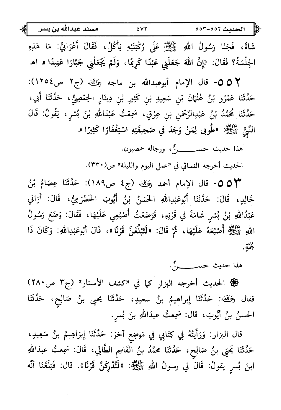 553 - قال الإمام أحمد رحمه الله (ج 4 ص 189): حَدَّثَنَا عِصَامُ بْنُ خَالِدٍ، قَالَ: حَدَّثَنَا أَبُو عَبْدِ اللهِ الْحَسَنُ بْنُ أَيُّوبَ الْحَضْرَمِيُّ، قَالَ: أَرَانِي عَبْدُ اللهِ بْنُ بُسْرٍ شَامَةً فِي قَرْنِهِ، فَوَضَعْتُ أُصْبُعِي عَلَيْهَا، فَقَالَ: وَضَعَ رَسُولُ اللهِ صَلَّى اللهُ عَلَيْهِ وَعَلَى آلِهِ وَسَلَّمَ أُصْبُعَهُ عَلَيْهَا، ثُمَّ قَالَ: «لَتَبْلُغَنَّ قَرْنًا». قَالَ أَبُو عَبْدِ اللهِ: وَكَانَ ذَا جُمَّةٍ.