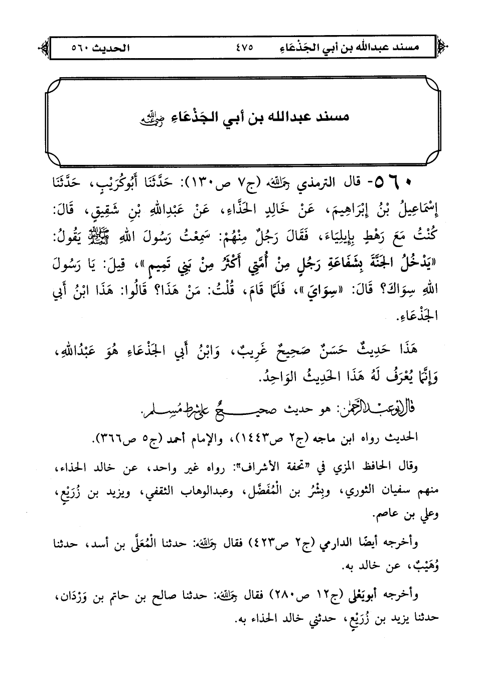 560 - قال الترمذي رحمه الله (ج 7 ص 130): حَدَّثَنَا أَبُو كُرَيْبٍ، حَدَّثَنَا إِسْمَاعِيلُ بْنُ إِبْرَاهِيمَ، عَنْ خَالِدٍ الحَذَّاءِ، عَنْ عَبْدِ اللهِ بْنِ شَقِيقٍ، قَالَ: كُنْتُ مَعَ رَهْطٍ بِإِيلِيَاءَ، فَقَالَ رَجُلٌ مِنْهُمْ: سَمِعْتُ رَسُولَ اللهِ صَلَّى اللهُ عَلَيْهِ وَعَلَى آلِهِ وَسَلَّمَ يَقُولُ: «يَدْخُلُ الجَنَّةَ بِشَفَاعَةِ رَجُلٍ مِنْ أُمَّتِي أَكْثَرُ مِنْ بَنِي تَمِيمٍ»، قِيلَ: يَا رَسُولَ اللهِ، سِوَاكَ؟ قَالَ: «سِوَايَ». فَلَمَّا قَامَ قُلْتُ: مَنْ هَذَا؟ قَالُوا: هَذَا ابْنُ أَبِي الجَذْعَاءِ.