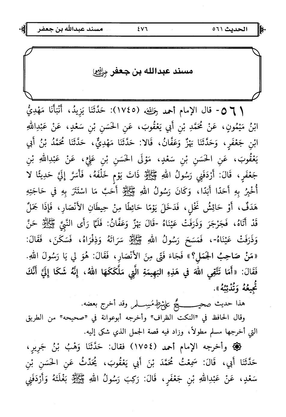 561 - قال الإمام أحمد رحمه الله (1745): حَدَّثَنَا يَزِيدُ، أنبأَنَا مَهْدِيُّ بْنُ مَيْمُونٍ، عَنْ مُحَمَّدِ بْنِ أَبِي يَعْقُوبَ، عَنِ الْحَسَنِ بْنِ سَعْدٍ، عَنْ عَبْدِ اللهِ بْنِ جَعْفَرٍ، وحَدَّثَنَا بَهْزٌ وَعَفَّانُ، قَالا: حَدَّثَنَا مَهْدِيٌّ، حَدَّثَنَا مُحَمَّدُ بْنُ أَبِي يَعْقُوبَ، عَنِ الْحَسَنِ بْنِ سَعْدٍ مَوْلَى الْحَسَنِ بْنِ عَلِيٍّ، عَنْ عَبْدِ اللهِ بْنِ جَعْفَرٍ، قَالَ: أَرْدَفَنِي رَسُولُ اللهِ صَلَّى اللهُ عَلَيْهِ وَعَلَى آلِهِ وَسَلَّمَ ذَاتَ يَوْمٍ خَلْفَهُ، فَأَسَرَّ إِلَيَّ حَدِيثًا لَا أُخْبِرُ بِهِ أَحَدًا أبدًا، وَكَانَ رَسُولُ اللهِ صَلَّى اللهُ عَلَيْهِ وَعَلَى آلِهِ وَسَلَّمَ أَحَبَّ مَا اسْتَتَرَ بِهِ فِي حَاجَتِهِ هَدَفٌ، أَوْ حَائِشُ نَخْلٍ، فَدَخَلَ يَوْمًا حَائِطًا مِنْ حِيطَانِ الْأَنْصَارِ، فَإِذَا جَمَلٌ قَدِ أتَاهُ، فَجَرْجَرَ وَذَرَفَتْ عَيْنَاهُ -قَالَ بَهْزٌ وَعَفَّانُ: فَلَمَّا رَأَى النَّبِيَّ صَلَّى اللهُ عَلَيْهِ وَعَلَى آلِهِ وَسَلَّمَ حَنَّ وَذَرَفَتْ عَيْنَاهُ-، فَمَسَحَ رَسُولُ اللهِ صَلَّى اللهُ عَلَيْهِ وَعَلَى آلِهِ وَسَلَّمَ سَرَاتَهُ وَذِفْرَاهُ فَسَكَنَ، فَقَالَ: «مَنْ صَاحِبُ الْجَمَلِ؟ » فَجَاءَ فَتًى مِنَ الْأَنْصَارِ فَقَالَ: هُوَ لِي يَا رَسُولَ اللهِ. فَقَالَ: «أَمَا تَتَّقِي اللهَ فِي هَذِهِ الْبَهِيمَةِ الَّتِي مَلَّكَكَهَا اللهُ، إِنَّهُ شَكَا إِلَيَّ أَنَّكَ تُجِيعُهُ وَتُدْئِبُهُ».